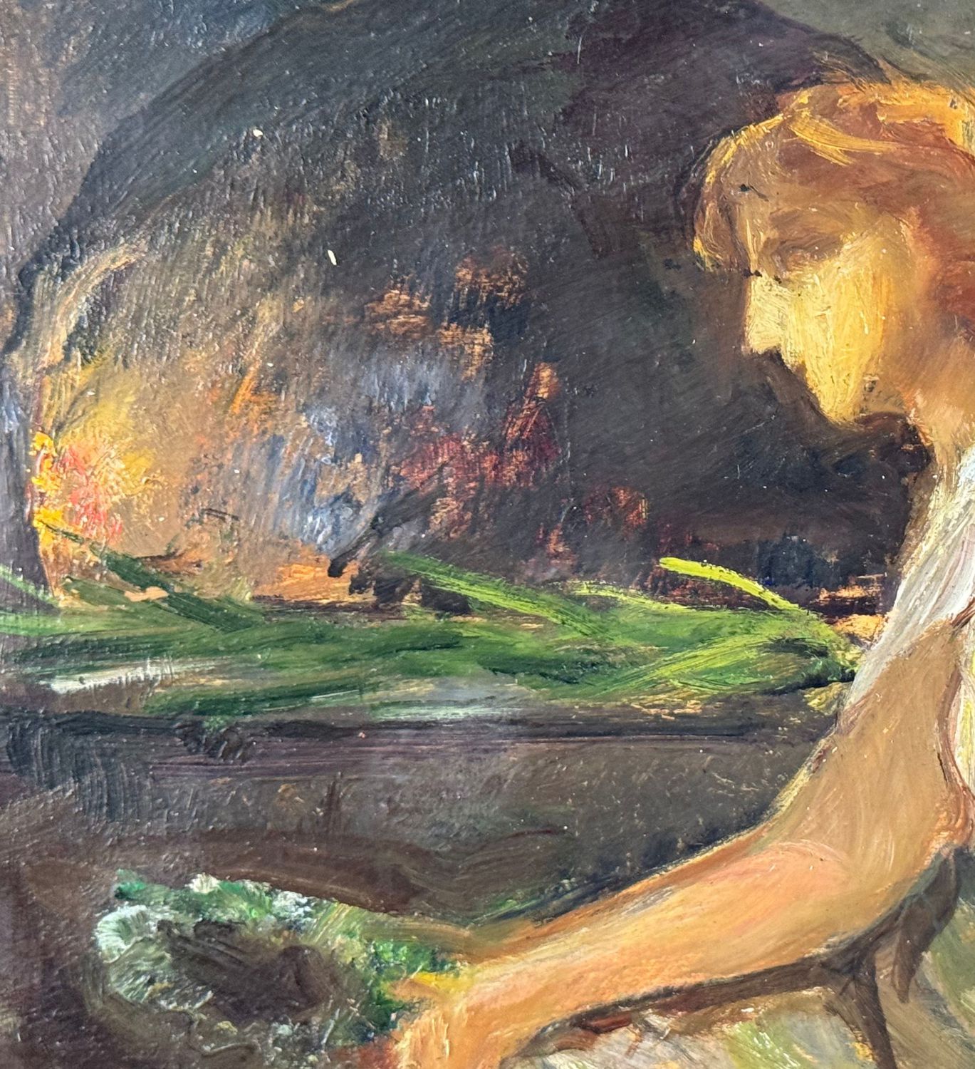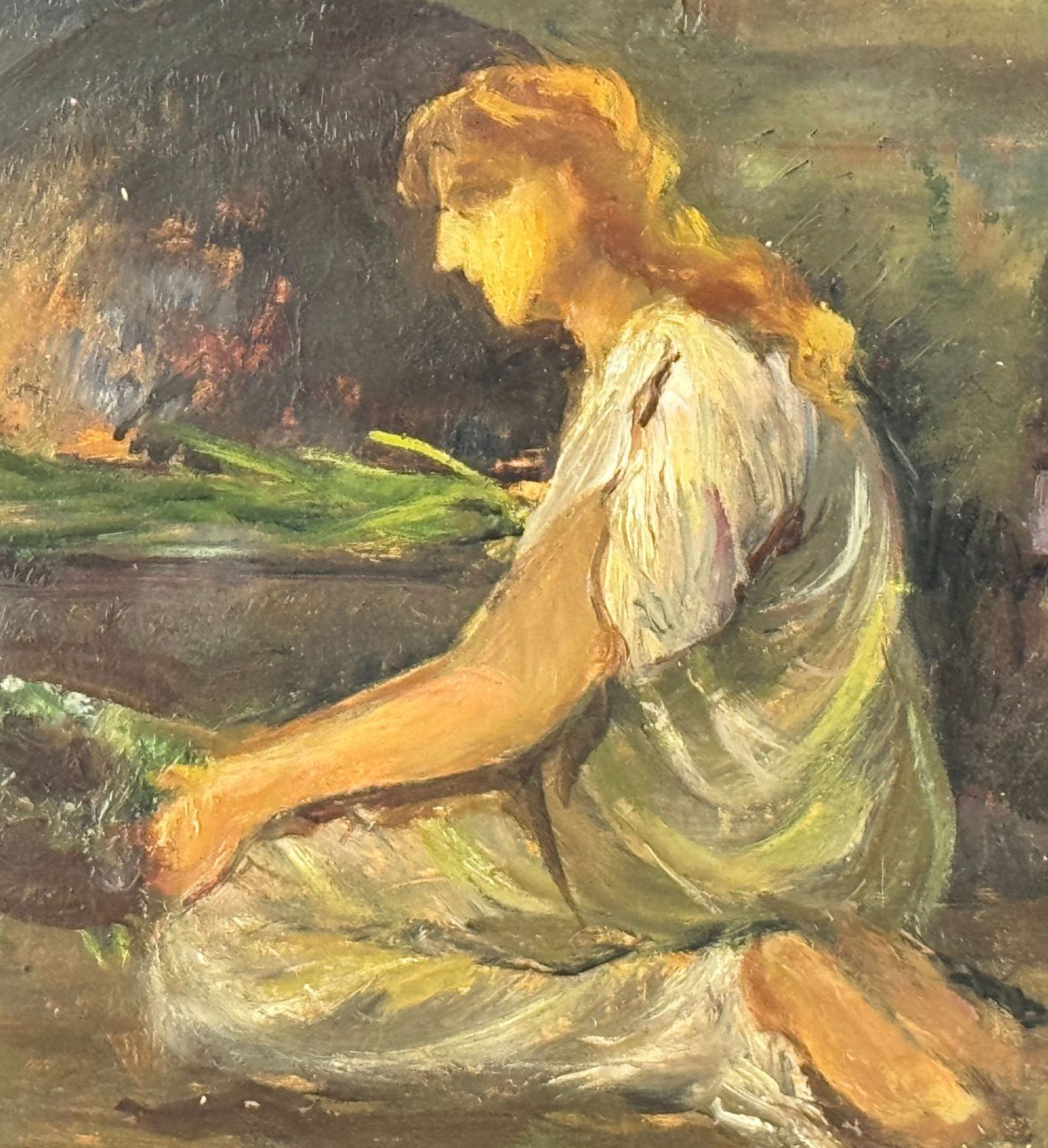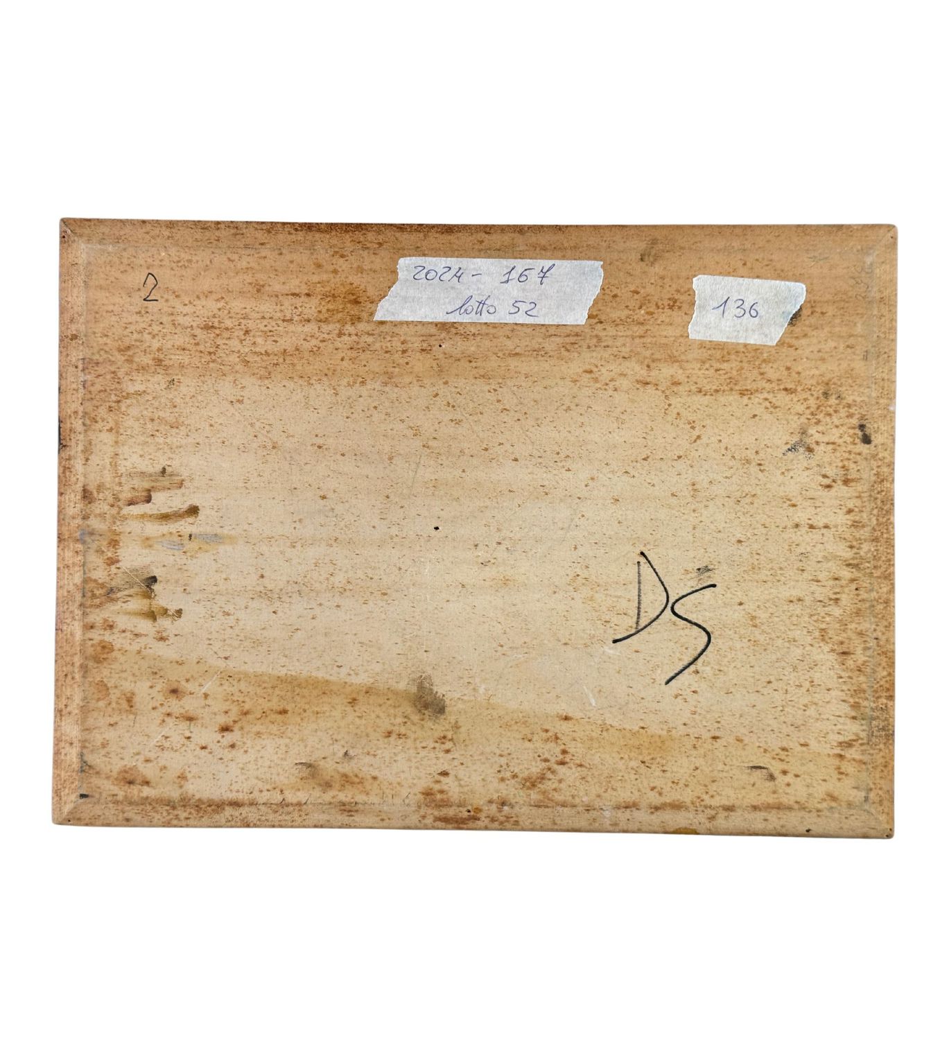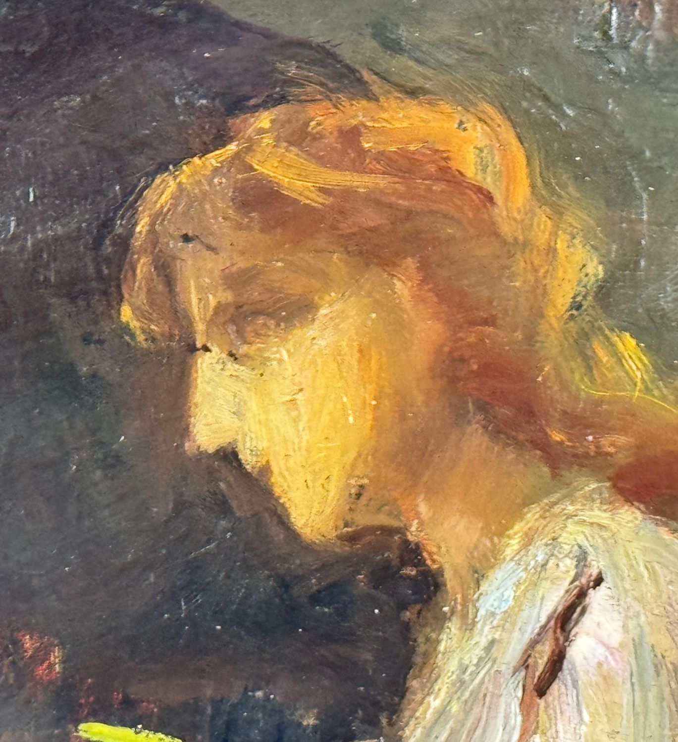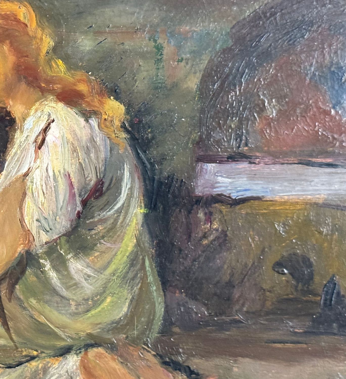 Dipinto olio su tavola, periodo XX secolo scuola Italiana, raffigurante Ritratto di donna al camino. Dimensioni: 33x24 cm. Reca firma in basso a destra da Angela Carugati. Opera in buone condizioni.