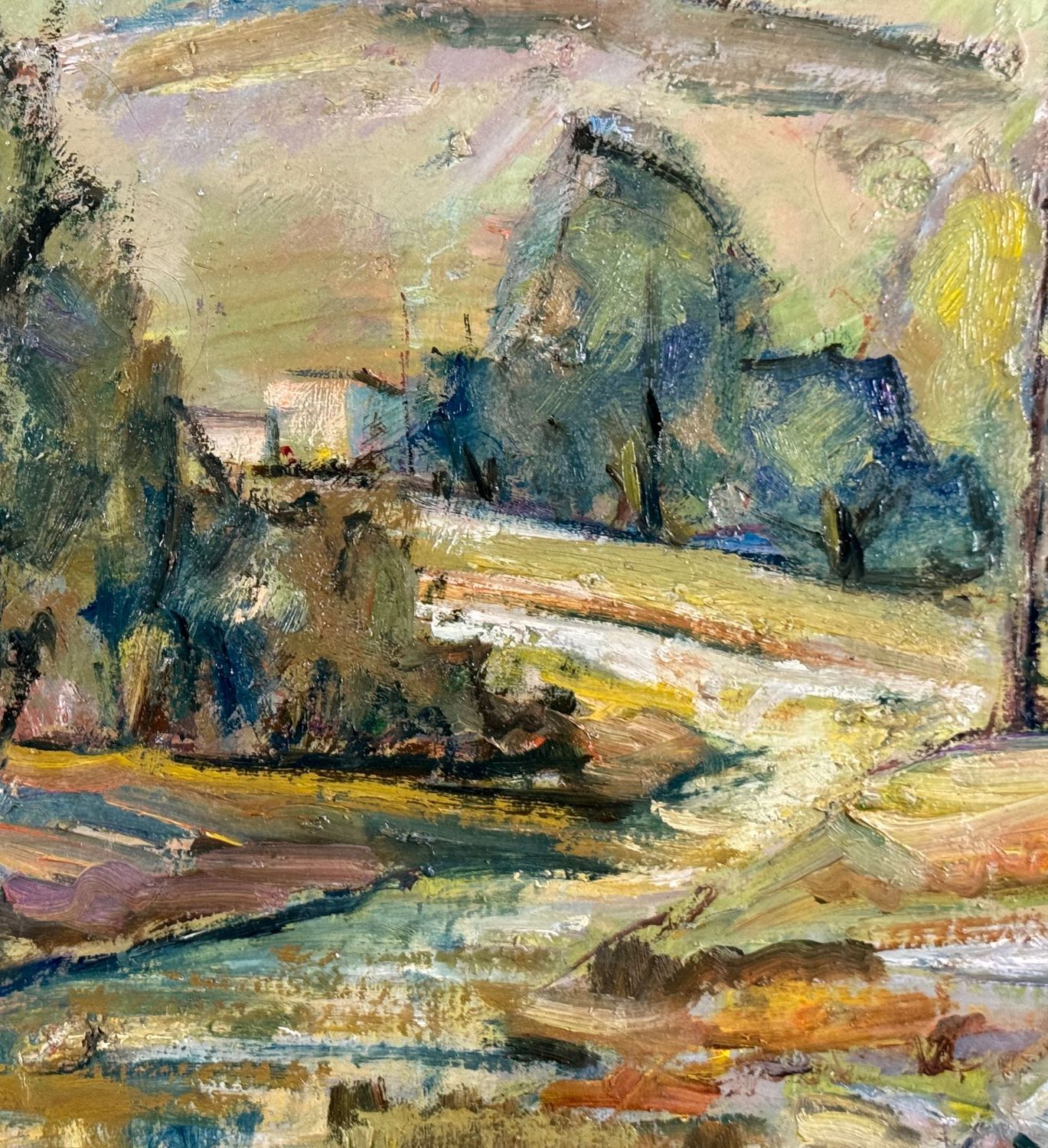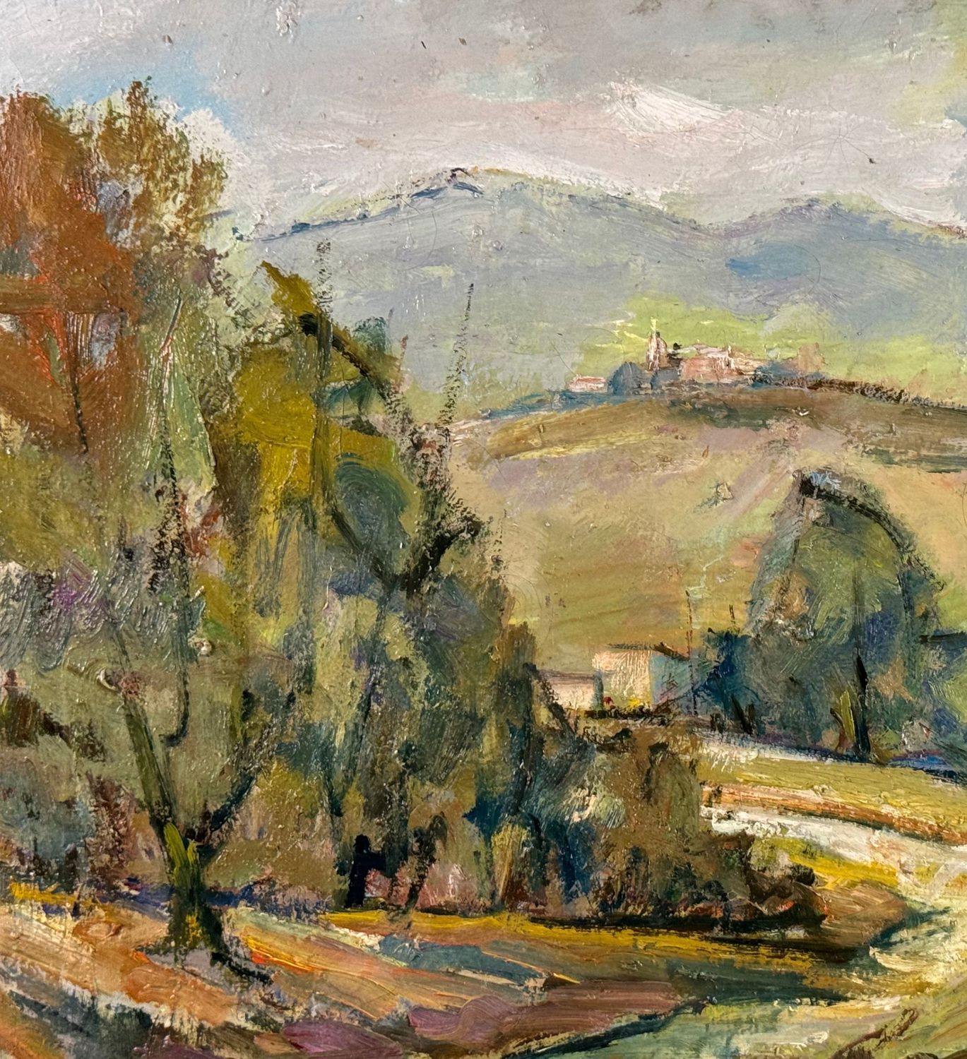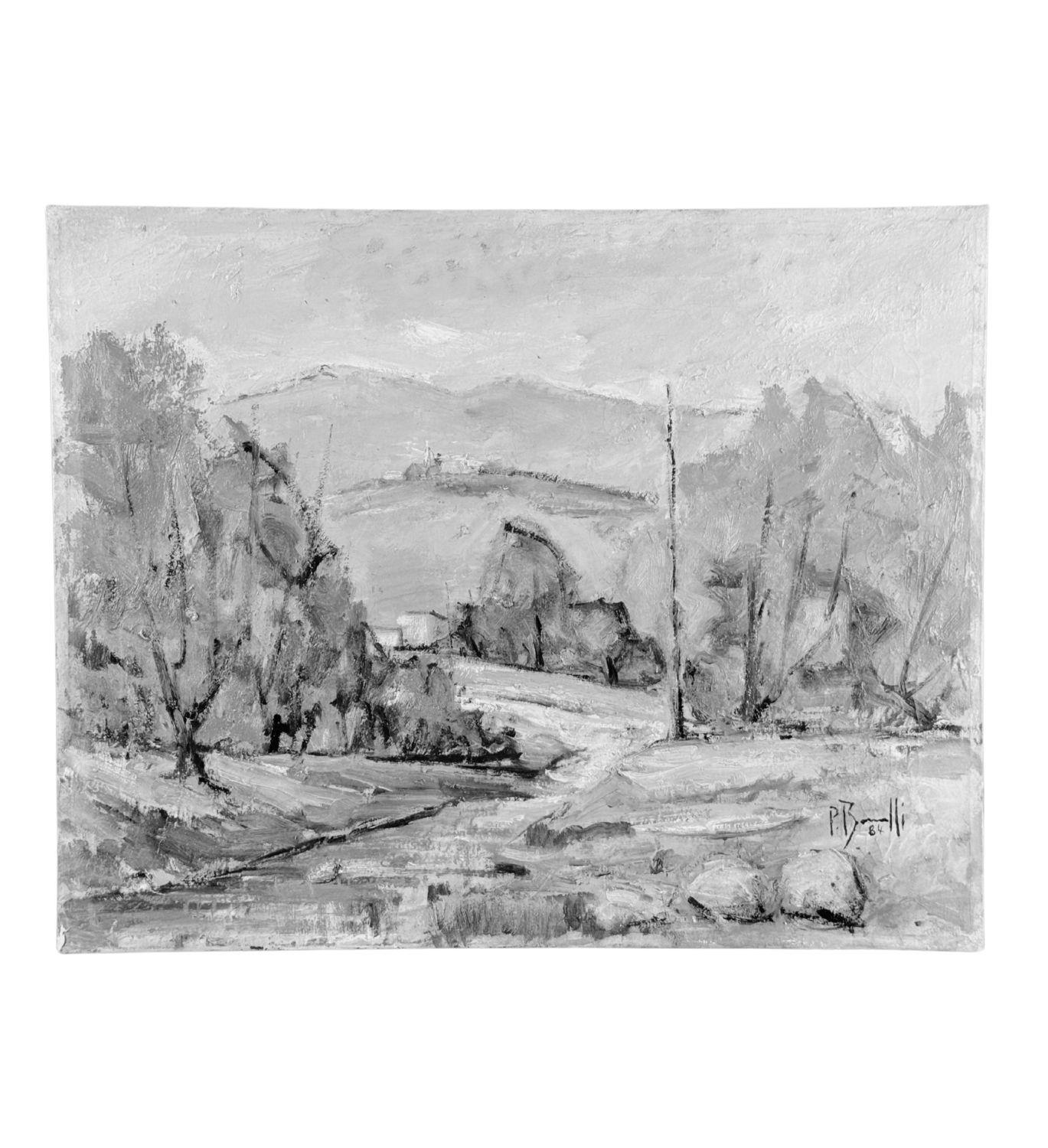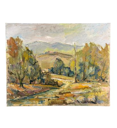 Dipinto olio su tela, periodo XX secolo scuola Italiana, raffigurante Paesaggio. Dimensioni: 50x40 cm. Reca firma in basso a destra da artista non identificato. Opera in buone condizioni.