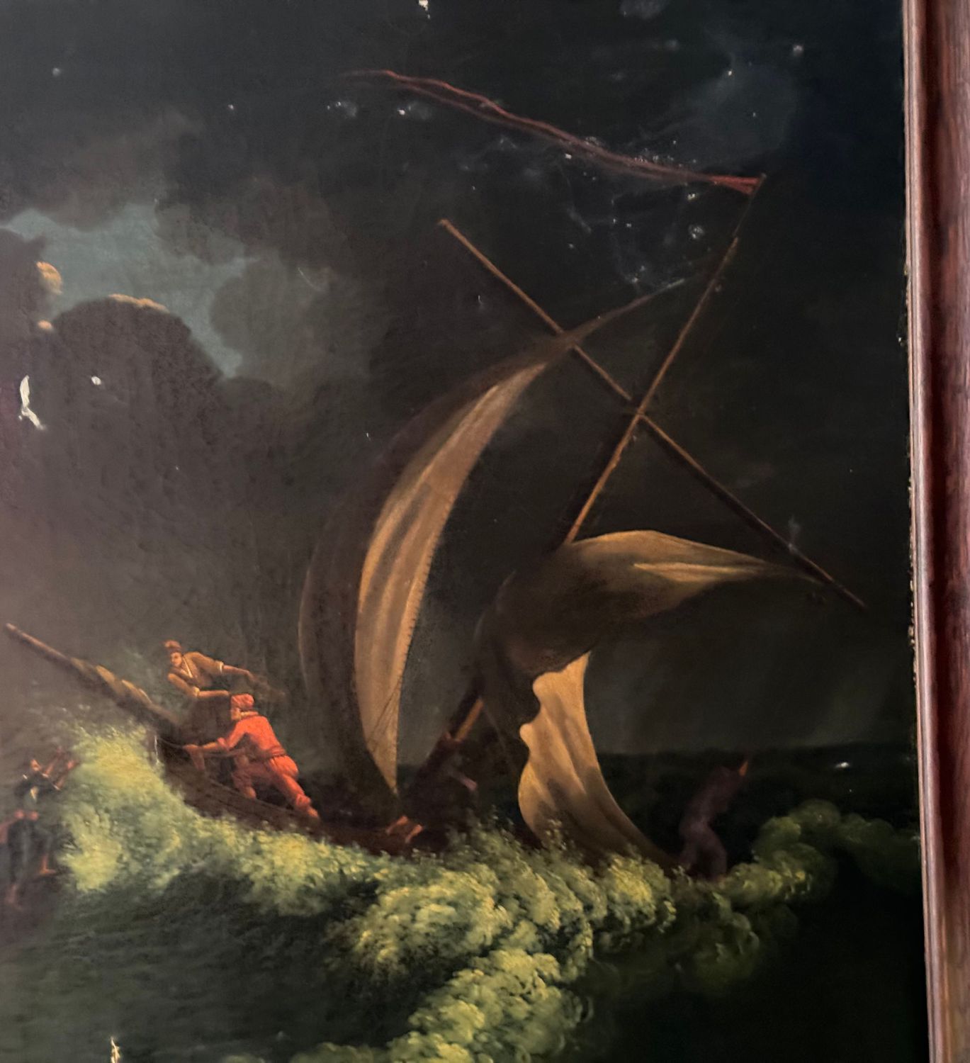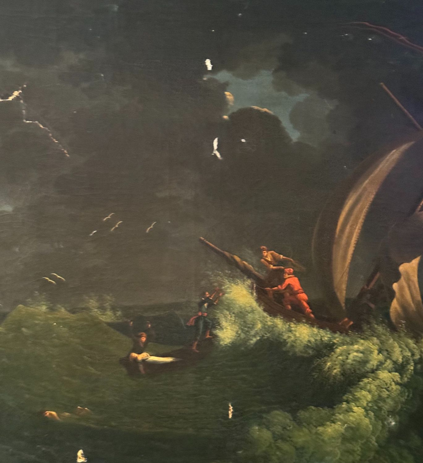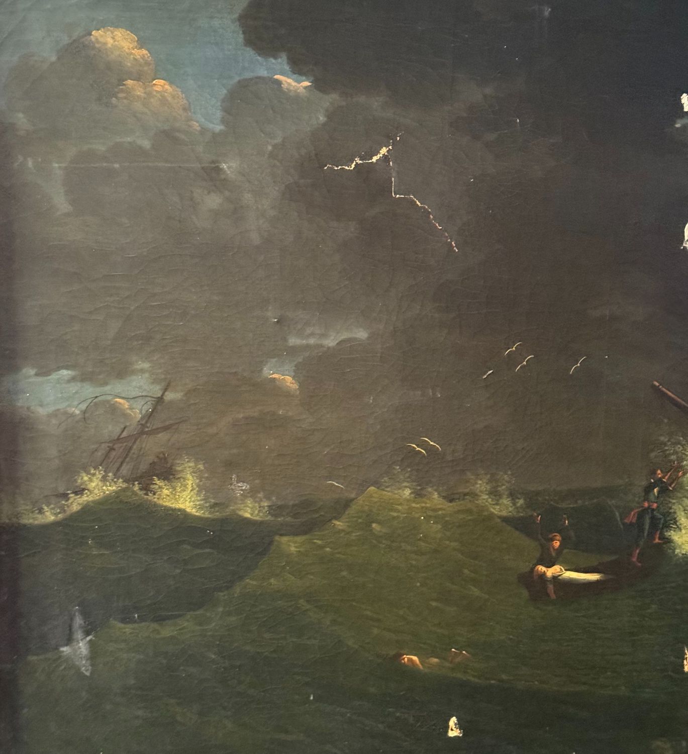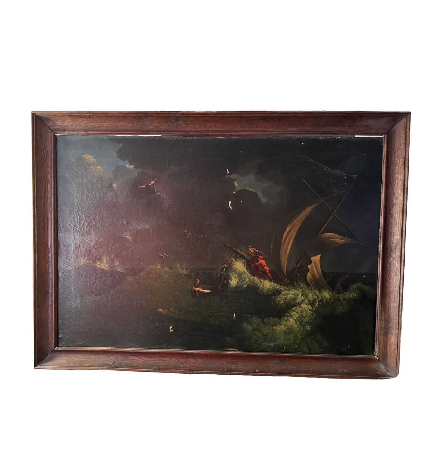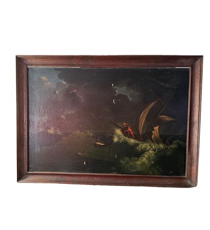 Dipinto olio su tela, periodo XIX secolo scuola Italiana, raffigurante Mareggiata. Dimensioni compreso cornice: 96x136 cm. Dimensioni interno cornice: 81x120 cm. Da artista anonimo. Opera in discrete condizioni, da segnalare taglio alla tela nella parte alta e piccole cadute di colore sparse come da foto allegate.