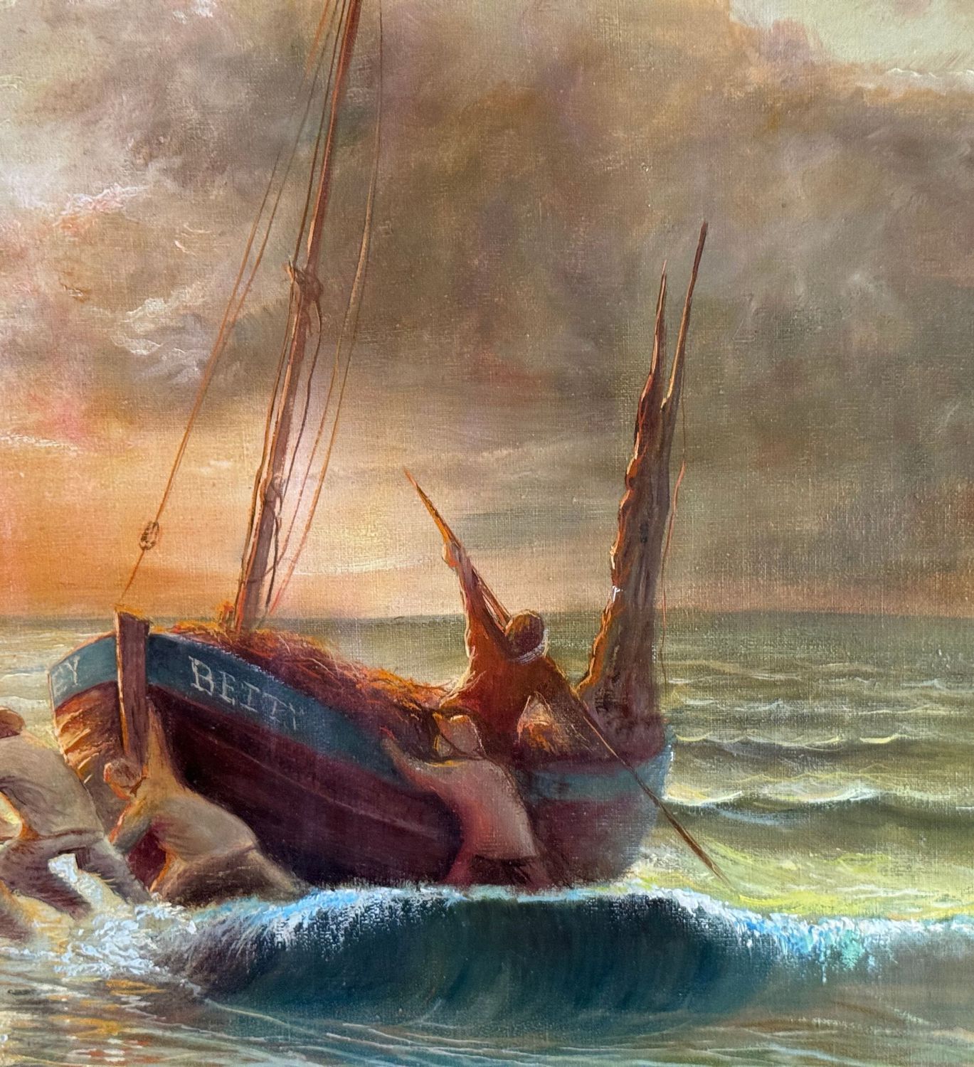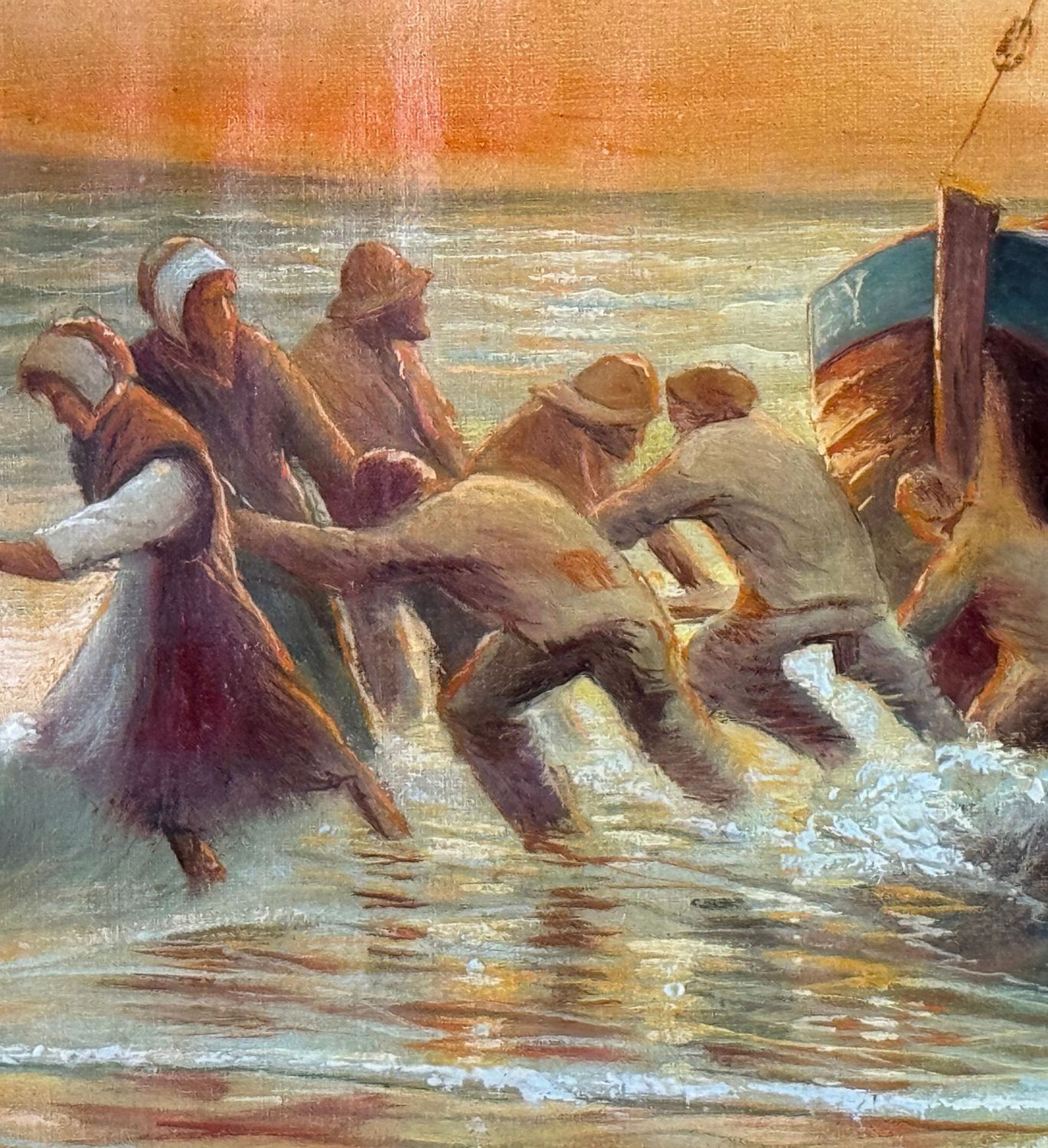 Dipinto olio su tela, periodo XX secolo scuola Italiana, raffigurante "Il tiro dei pescatori". Dimensioni compreso cornice: 75x105 cm. Dimensioni interno cornice: 38x67 cm. Da artista anonimo. Opera in buone condizioni.