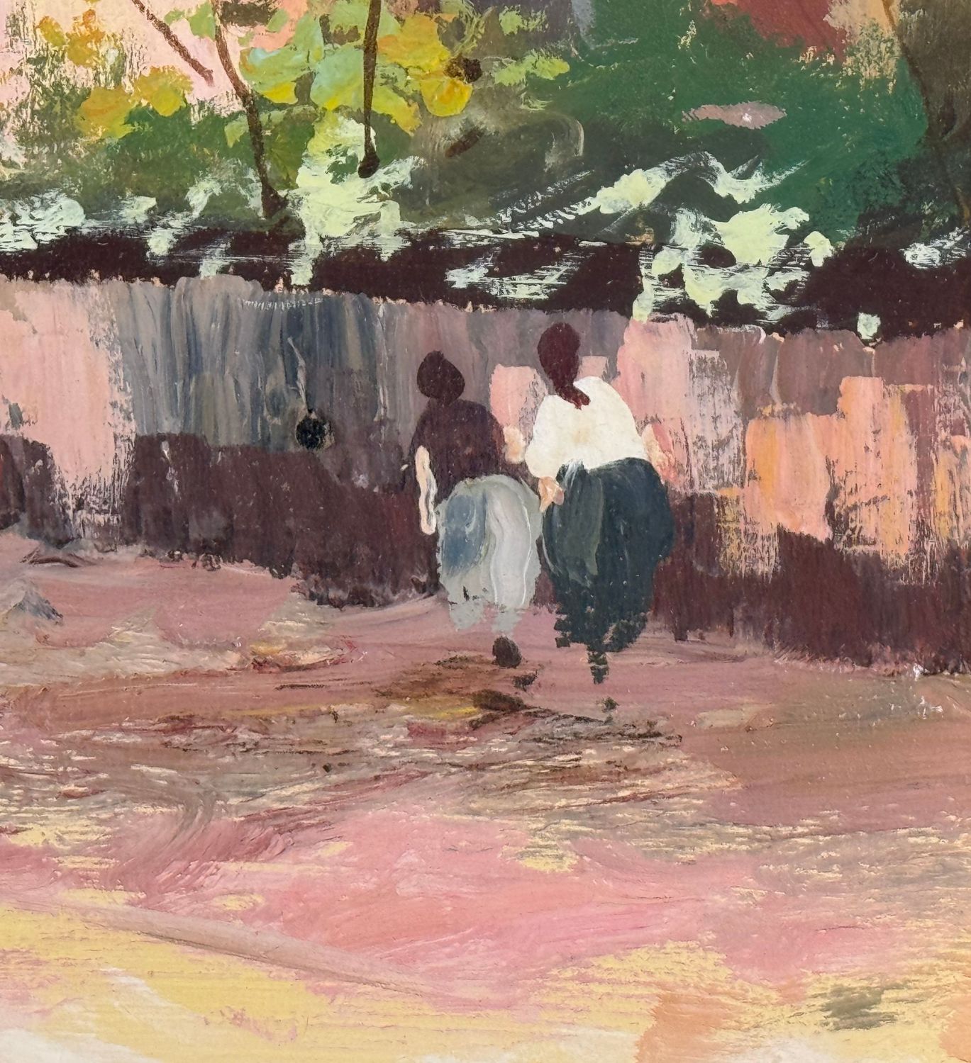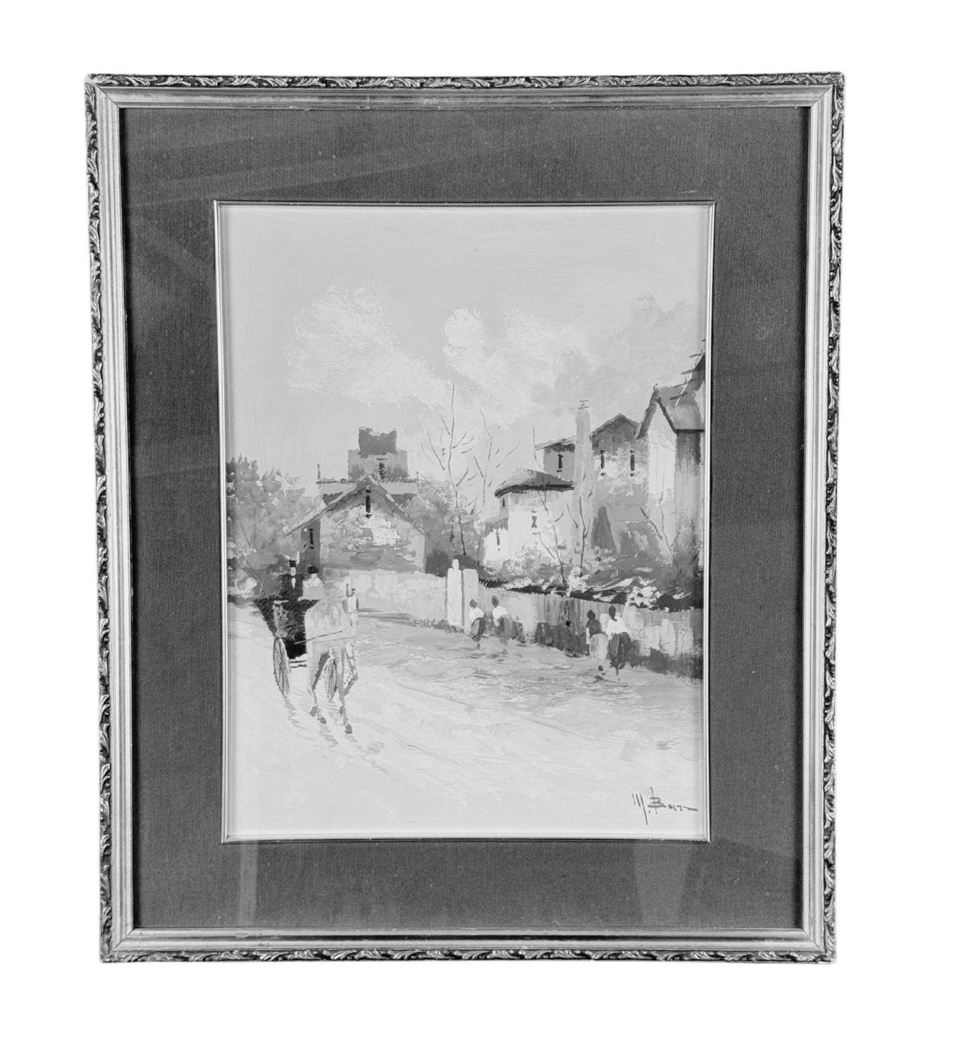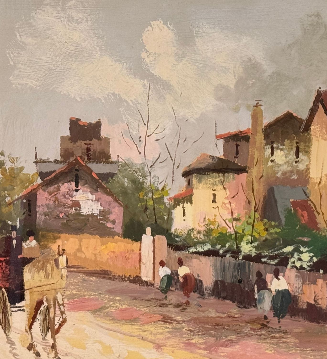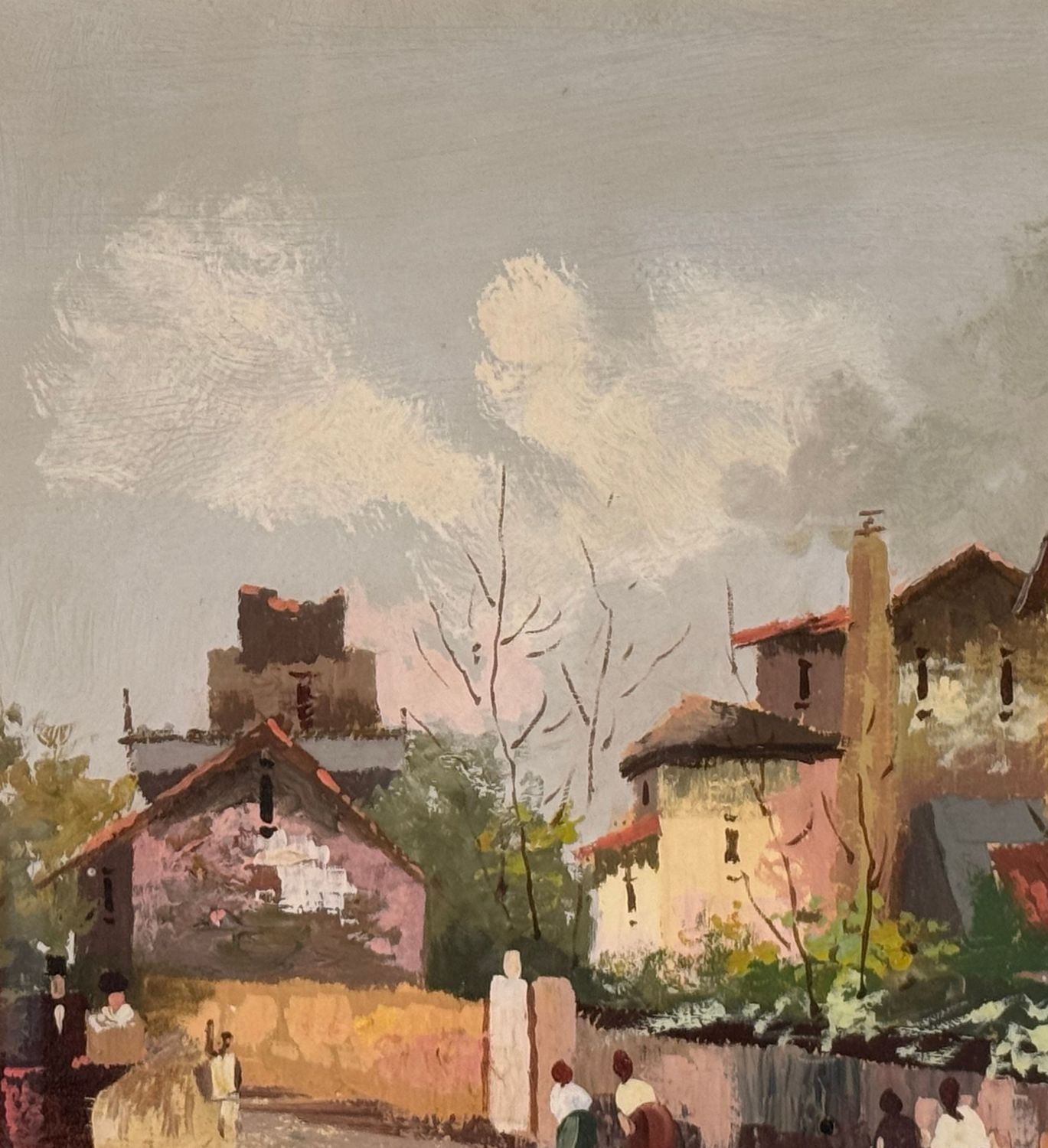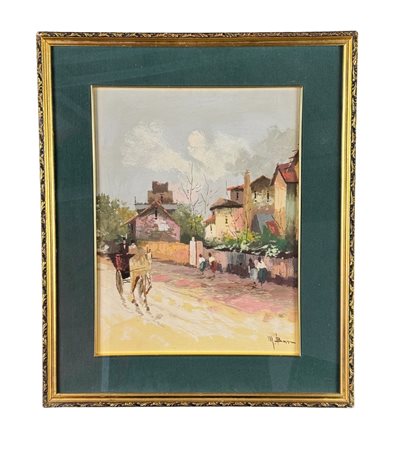 Dipinto olio su cartoncino, periodo XX secolo, scuola Italiana, raffigurante Stradina con personaggi. Dimensioni compreso cornice: 46x55 cm. Dimensioni interno cornice: 30x40 cm. Reca firma in basso a destra artista non identificato. Opera in buone condizioni.