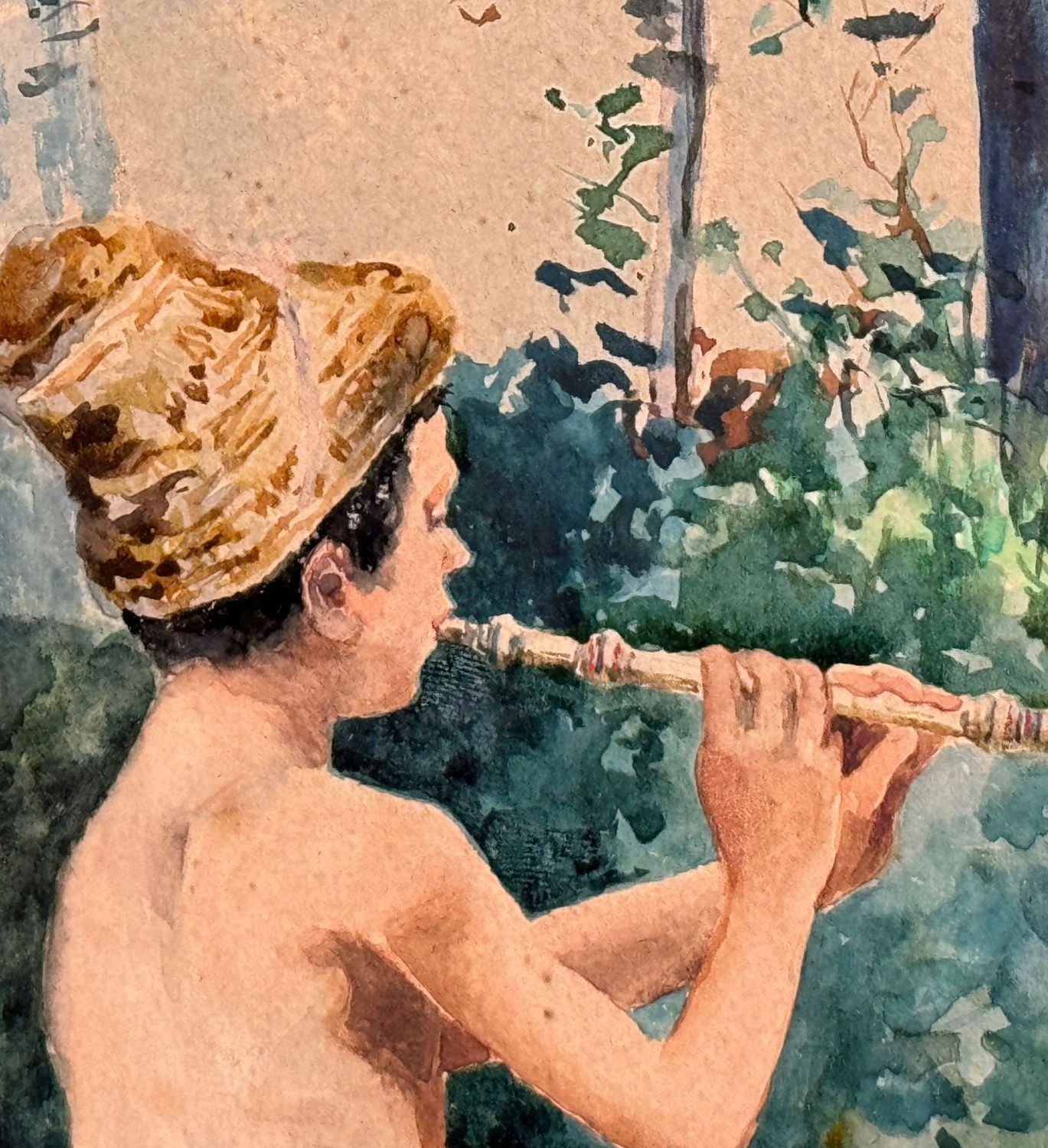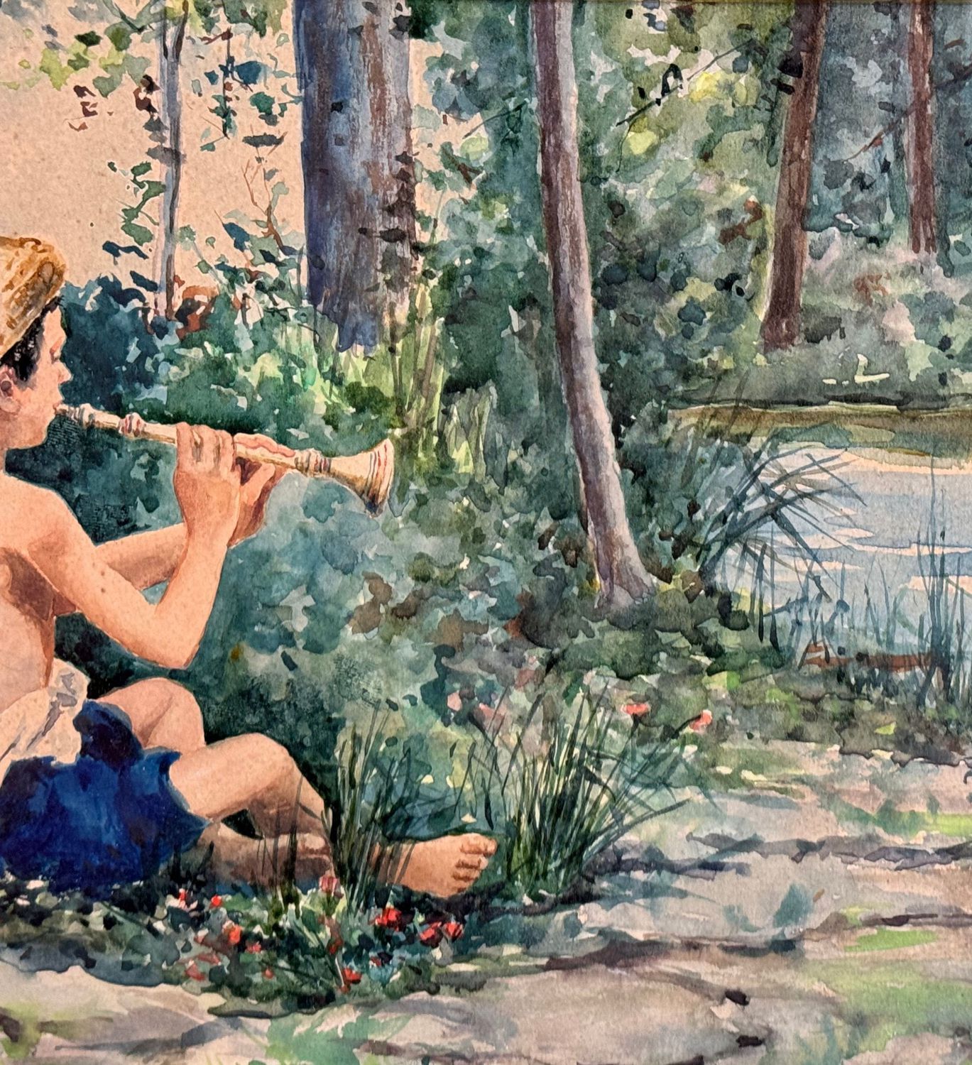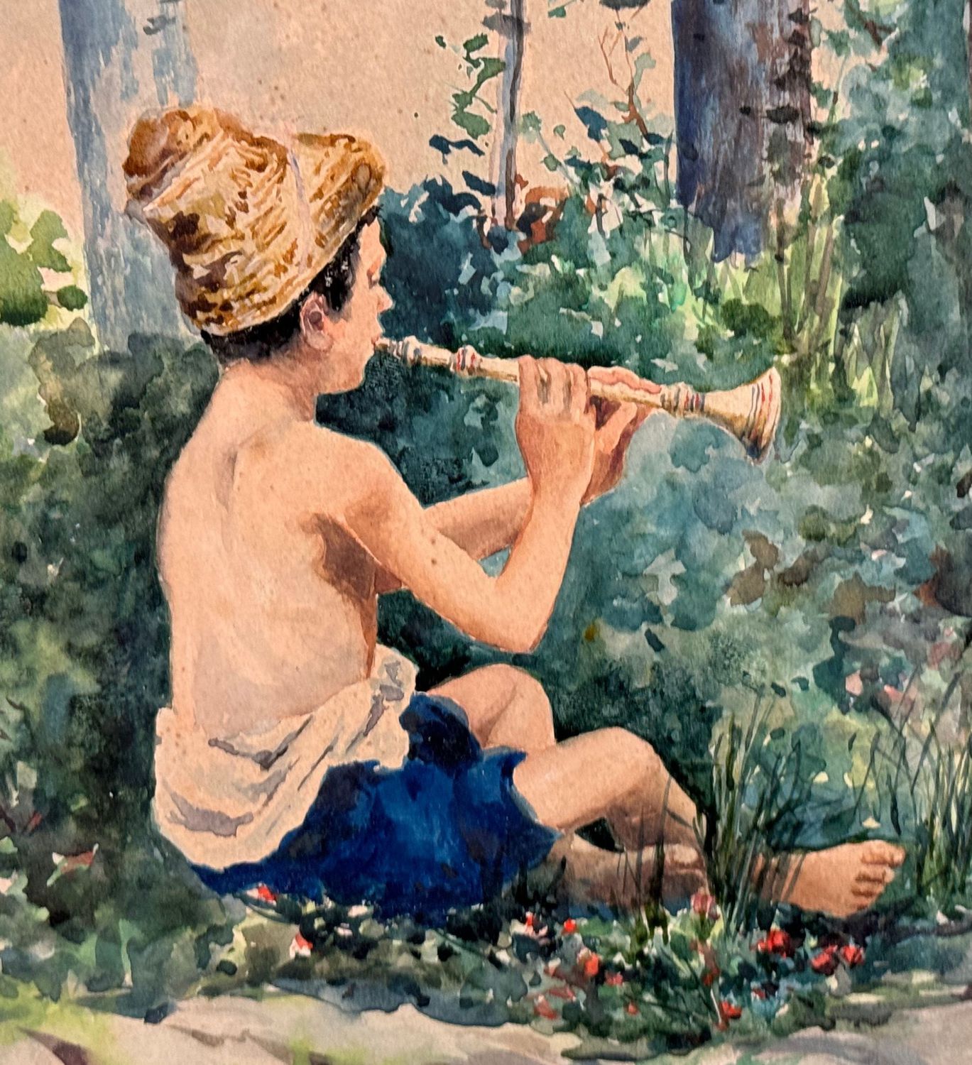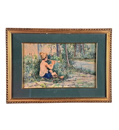 Acquerello su carta, periodo primi anni del XX secolo, scuola Italiana, raffigurante Giovane con flauto. Dimensioni compreso cornice: 47x33 cm. Dimensioni interno cornice: 33x20 cm. Reca firma in basso a destra G. Miraclia. Opera in buone condizioni.