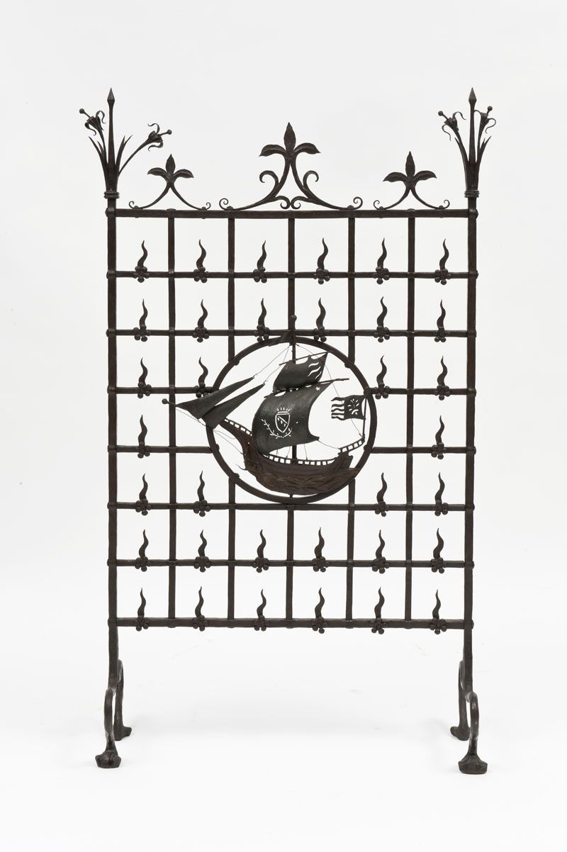 Umberto Bellotto (1882 - 1940) - (ambito di) Parascintille in ferro forgiato e battuto, decorato con un veliero nel riquadro centrale. Italia, anni 20/30 del sec XX (cm 85x140h)