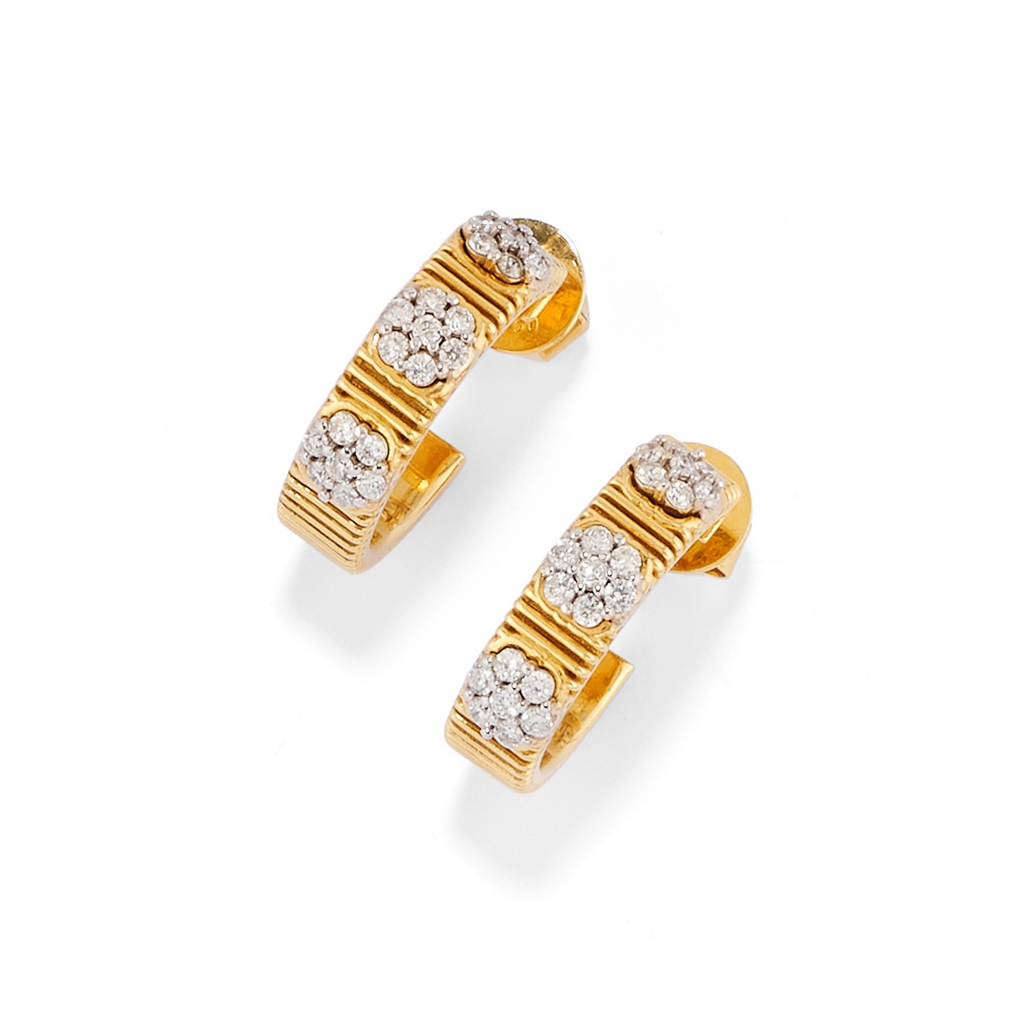 a mezza creola, con motivo floreale con diamanti taglio brillante per totale ct 0,70 (caratura incisa), chiusura a perno e farfalla.