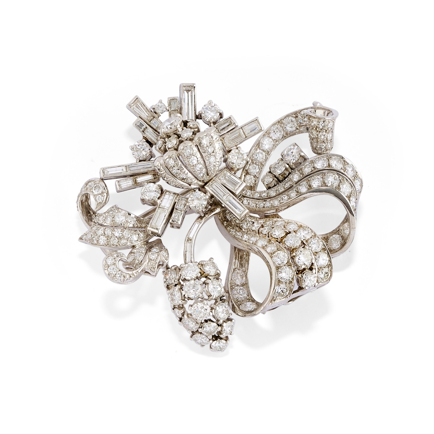 con disegno a volute, frutti e fiori, interamente decorata da diamanti taglio brillante, huit-huit, baguette per totale ct 8,00 circa.