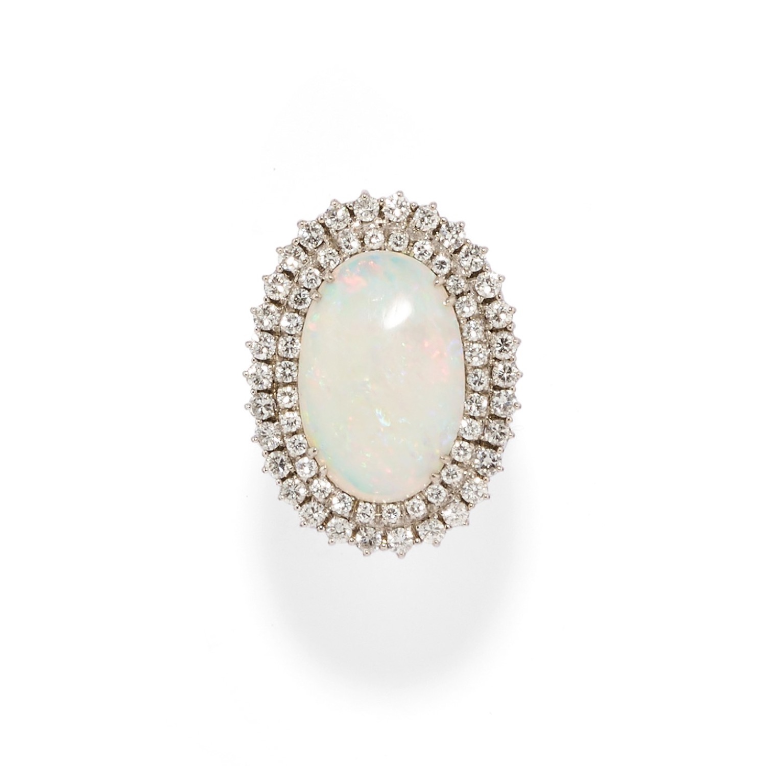 al centro opale taglio ovale cabochon di mm 19,00x12,50 circa entro doppio contorno di diamanti taglio brillante per totale ct 1,50 circa.