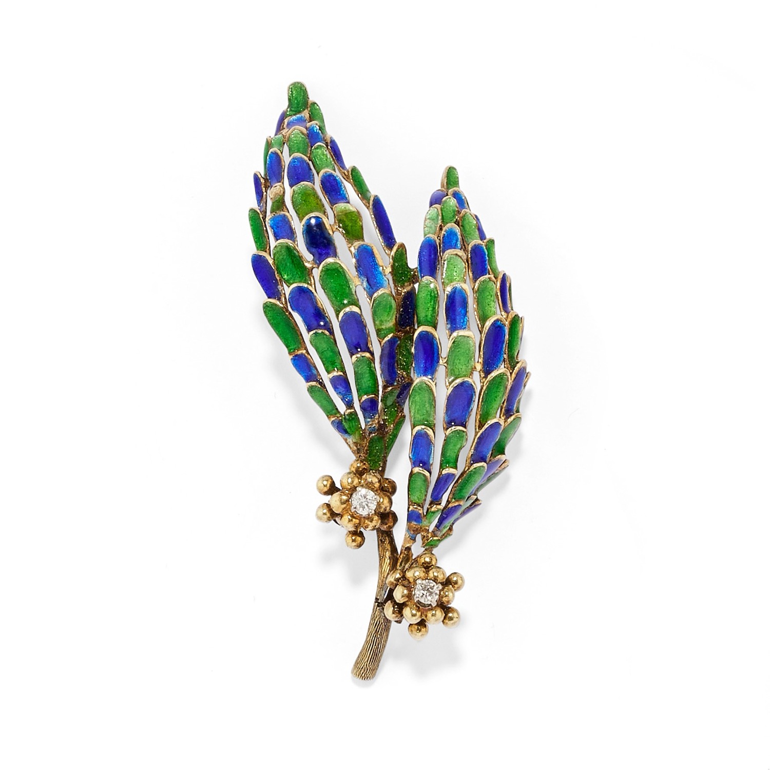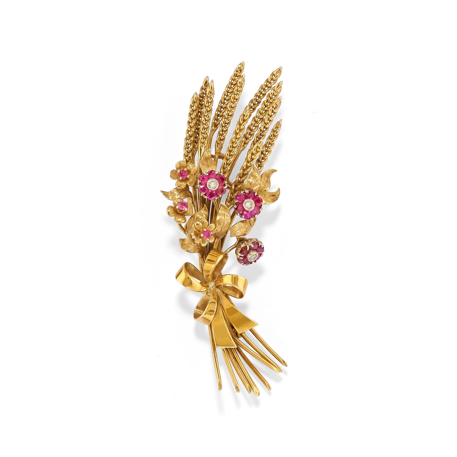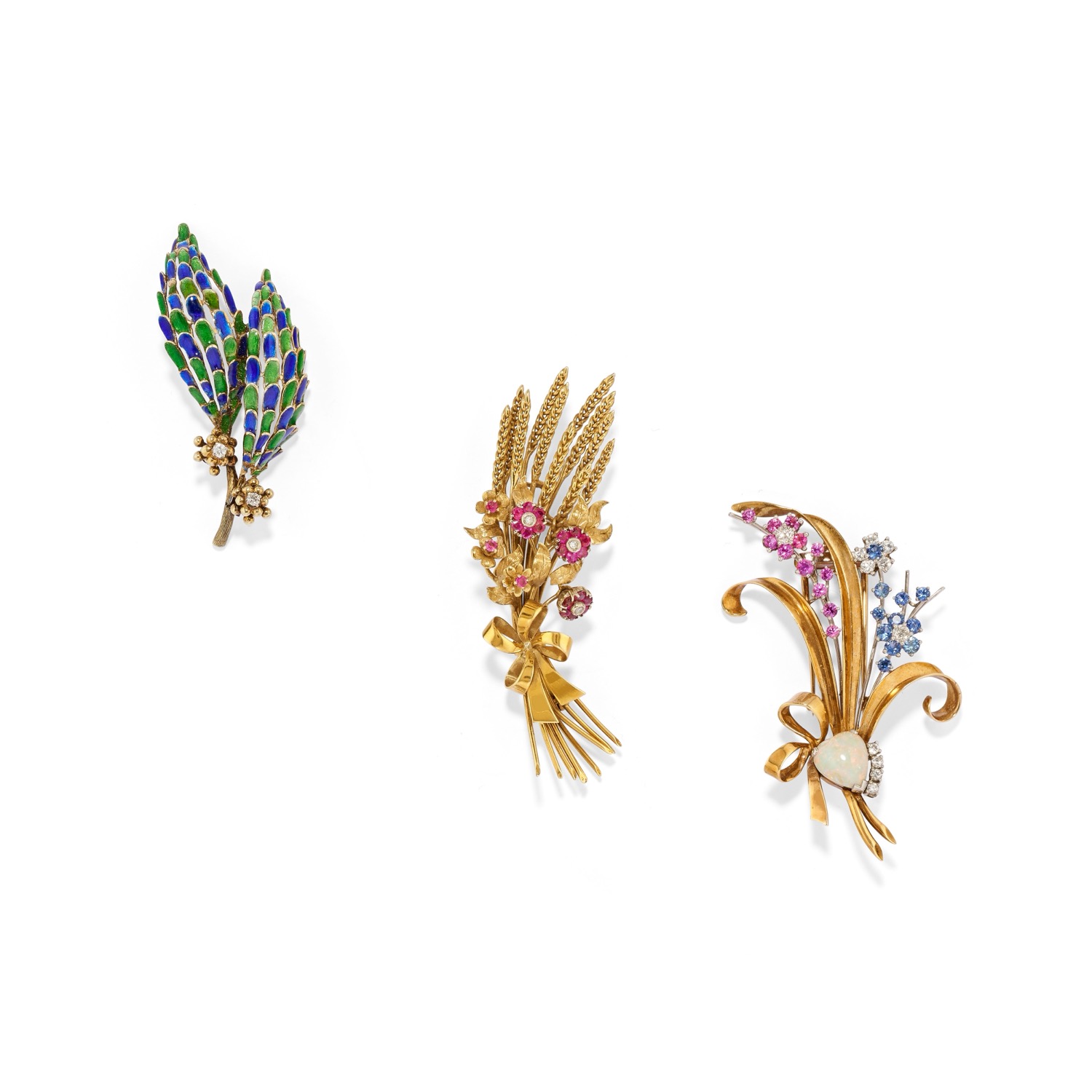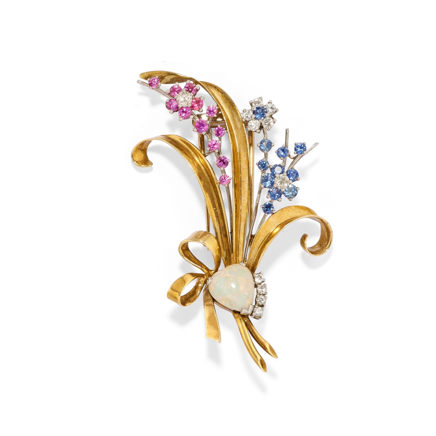a bouquet, decorate con smalti policromi blu e verdi, fiori in rubini, zaffiri e diamanti e opale taglio cuore cabochon.