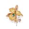a foggia di giglio, al centro diamante taglio vecchio di ct 0,35 circa, smeraldo taglio goccia dt ct 0,50 circa e frutto con rubini taglio rotondo e diamanti taglio rosa a decoro.