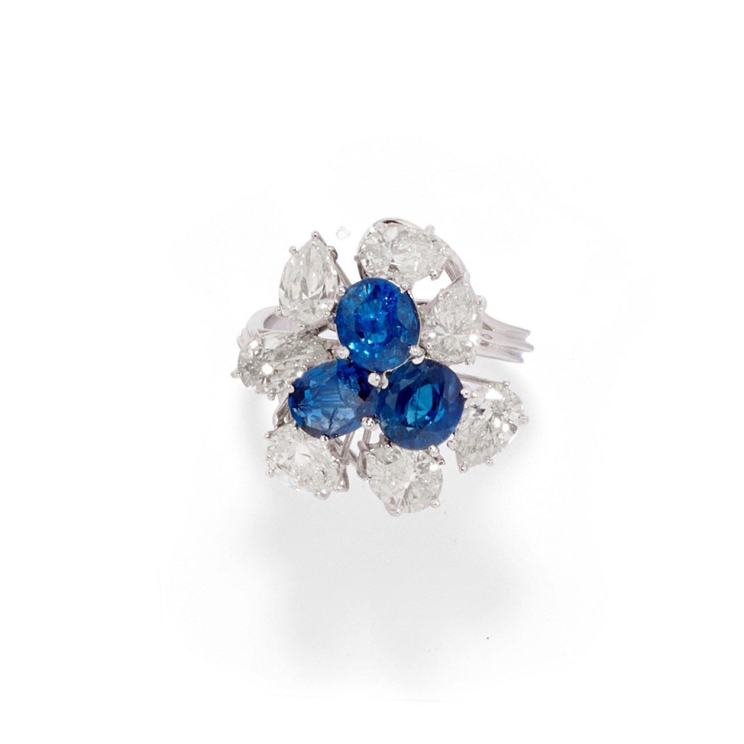 disegno a fiore, al centro zaffiri taglio ovale per totale ct 3,00 circa e diamanti taglio goccia per totale ct 2,20 circa.