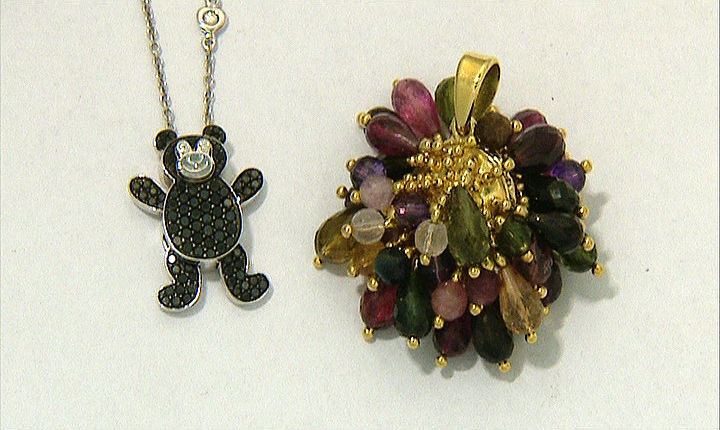 LOTTO DI DUE GIOIELLI. In oro bianco e giallo 18 kt composto da ciondolo con gemme multicolor taglio briolette (prob. tormaline) su motivi frangiati e da ciondolo ad orsetto snodato con decoro in diamanti neri ed incolore taglio brillante per tot. cts. 0,78 ca., trattenuto da catenina in oro bianco 18 kt con allegato certificato di autenticità Babila Milano.