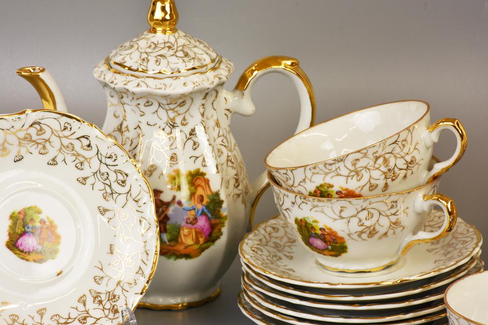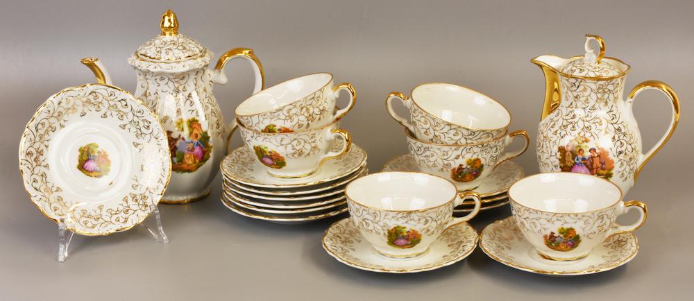 Lot 53 | SERVIZIO DA THE in porcellana decorata a motivi vegetali dorati e scene...