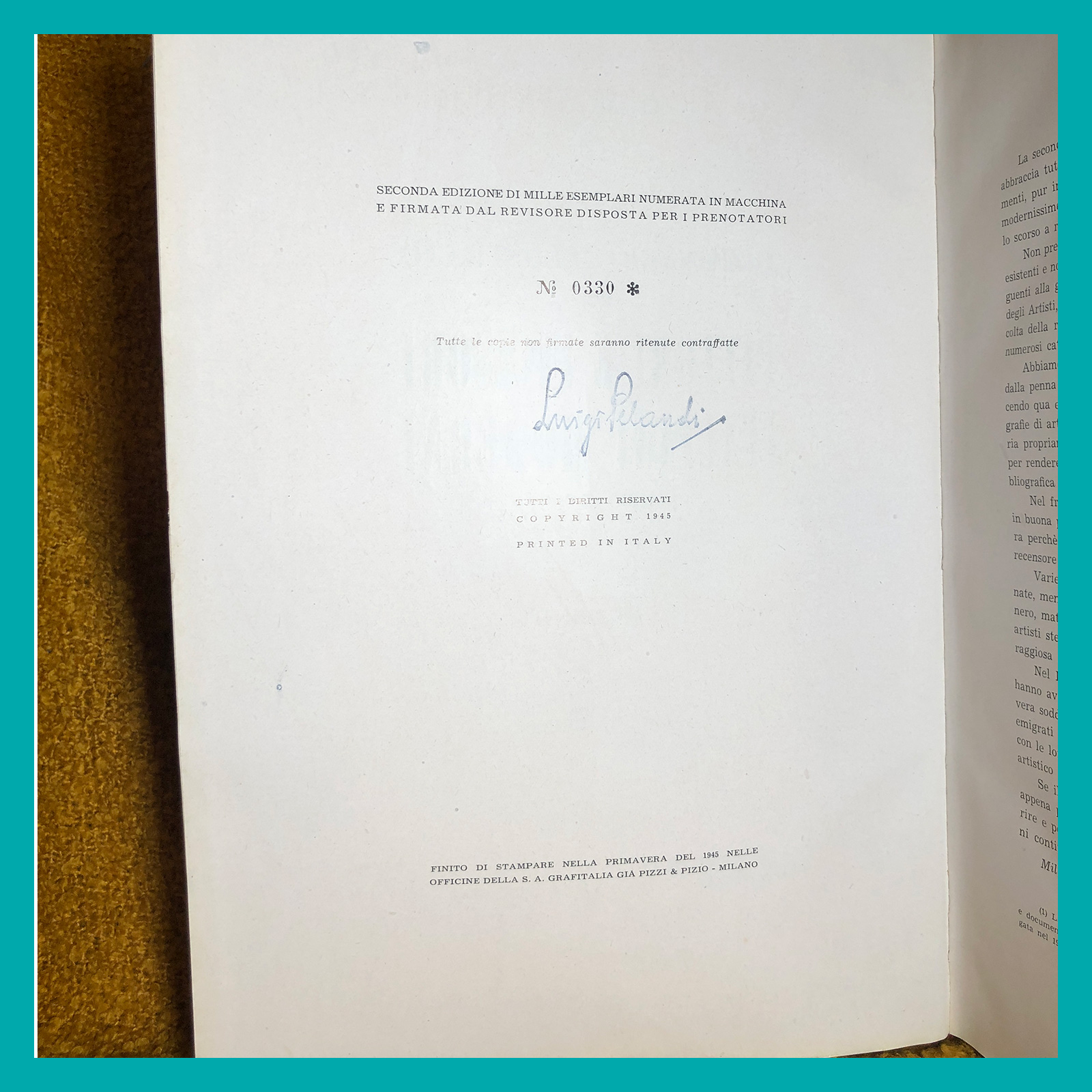 A. M. Comanducci, Dizionario Illustrato dei Pittori e Incisori Italiani Moderni (1800 - 1900). Seconda edizione riveduta da L. Pelandi, opera in due volumi, S.A. Grafitalia già Pizzi & Pizio - Milano, seconda edizione di mille esemplari numerata in macchina a firmata dal revisore disposta per i prenotatori, esemplare n. 0330, Milano 1945. Difetti alla copertina.