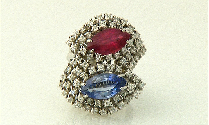 ANELLO. In oro bianco 18 kt montatura a cestello con alla sommità rubino (visibili sostanze estranee migliorative) e zaffiro taglio marquise disposti a contrariè per tot. cts. 7,50 ca. entro contorno in diamanti taglio brillante tot. cts. 2,00 ca.