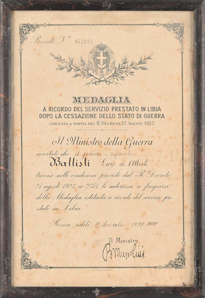 Insegna da Cavaliere dell'Ordine coloniale della Stella d'Italia in metallo dorato e smaltato con nastrino e Diploma allegato; Medaglia in bronzo con nastrino della Campagna Italo Tedesca in Africa; Diploma della Medaglia a ricordo del Servizio prestato in Libia