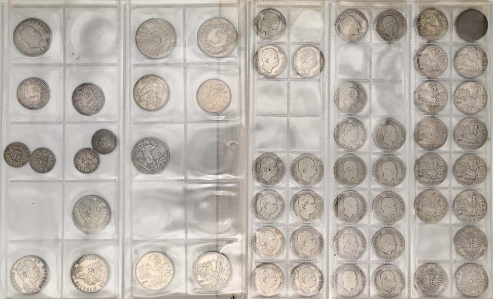 Lotto di 44 monete da 1 Lira e 2 Lire del Regno d'Italia; e 11 di Svizzera, Francia, Olanda, Grecia e Germania Si segnalano 2 Lire 1885 Umberto I; 2 Lire 1863 Napoli Valore; 1 Lira 1863 Torino Stemma Vittorio Emanuele II; 1 Lira 1909 e 1916 Vittorio Emanuele III
