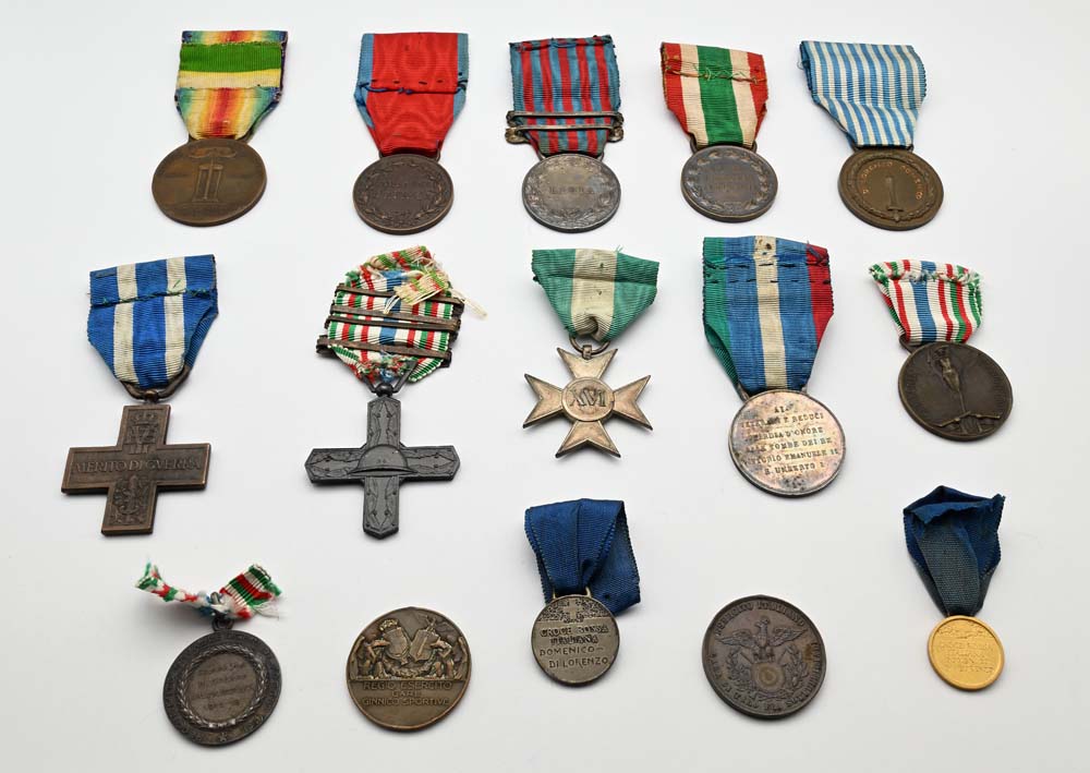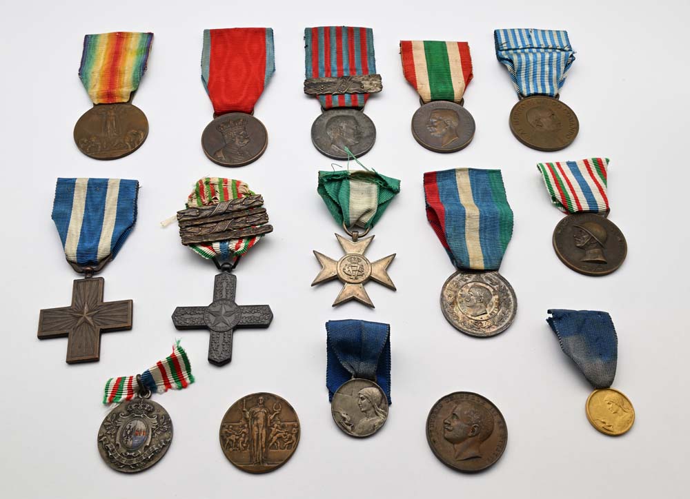 Lotto 15 medaglie in argento e bronzo del Regno d'Italia: Campagna d'Africa, Campagna di Libia, Prima Guerra Mondiale, Al merito di Guerra e Lungo comando, Croce Rossa e Tiri Umberto I e Vittorio Emanuele III Con nastrini e mostrine originali