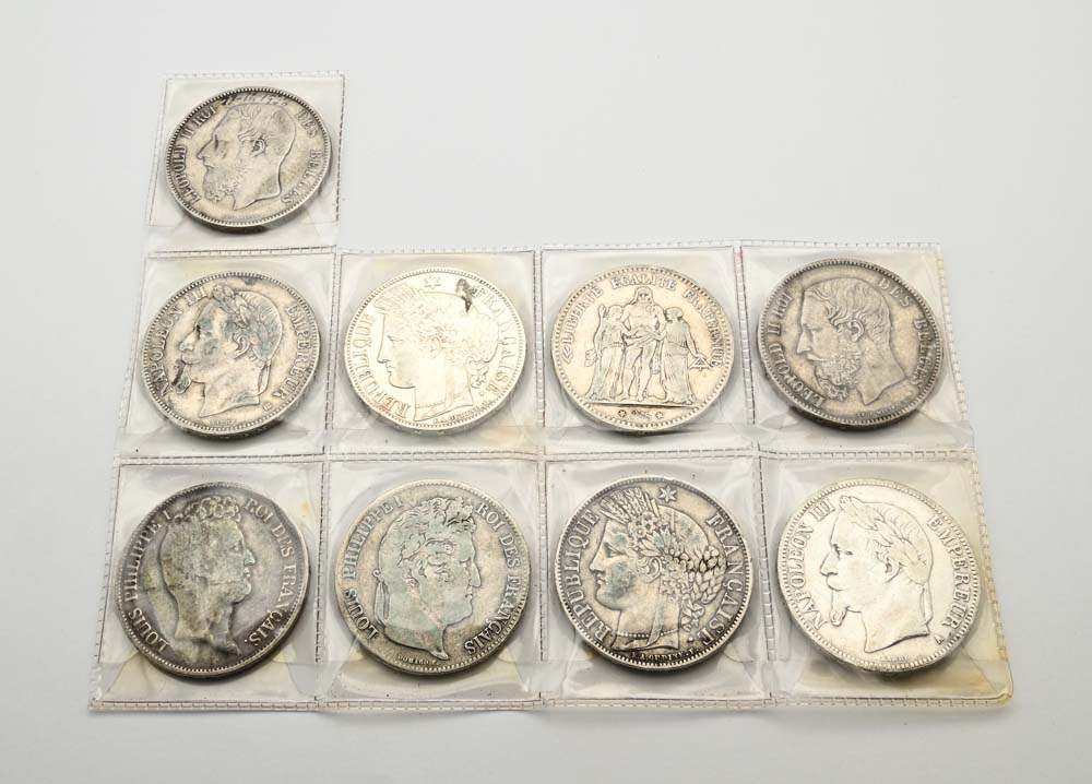 Lotto di 9 monete da 5 franchi 1831W, 1837W Luigi Filippo, 1851A 2a Repubblica, 1867A, 1868BB, Napoleone III, 1870A, 1876A 3a Repubblica Francia; 1873, 1876 Leopoldo II Belgio