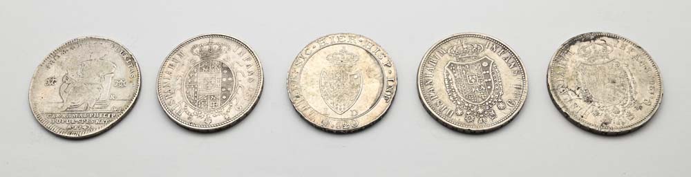 Lotto di 5 Piastre da 120 Grana: 1747 per la Nascita del principe Filippo. Carlo III di Borbone; del 16° tipo 1805 e del 17° tipo 1815, Ferdinando IV di Borbone Regno di Napoli; del 1° tipo 1818 e del 2° tipo 1818 Ferdinando I Regno 2 Sicilie