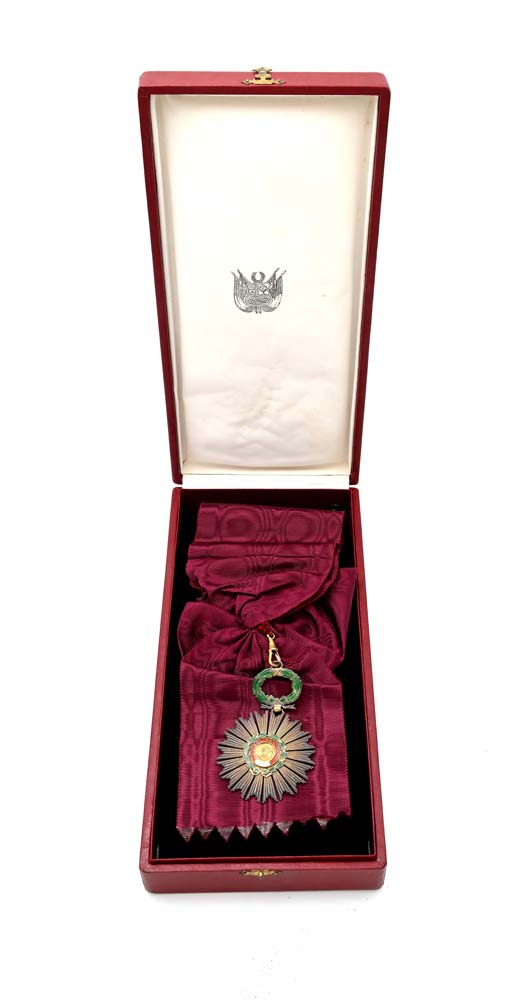 Ordine del Sole del Perù - Insegna di gran croce in metallo e smalto, con collare in nastro viola e bottone. Realizzato da Lemaitre & Fils Paris Entro astuccio originale. Fondato l'8 ottobre 1821 dal generale José de San Martín che volle premiare quanti si fossero distinti nella rivolta anti-spagnola. L'Ordine venne inizialmente concesso in maniera discontinua nei successivi quattro anni per poi cadere in disuso. Venne recuperato nel 1921 in occasione del primo centenario della sua fondazione.