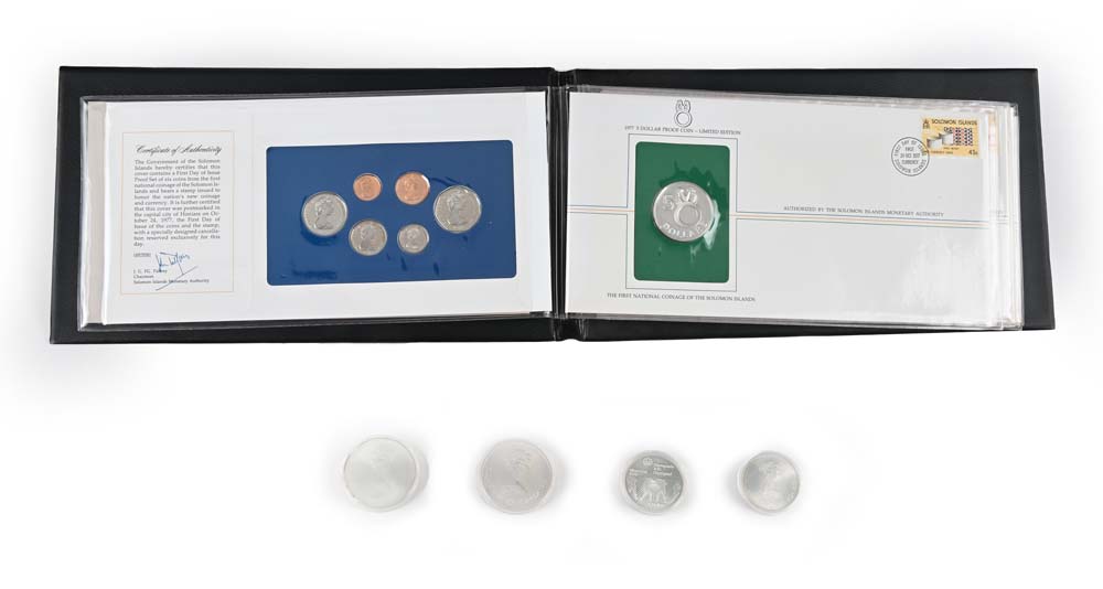 Lotto di monete Proof e cartamoneta First Issue 1977 Salomon Islands; 2 pezzi...