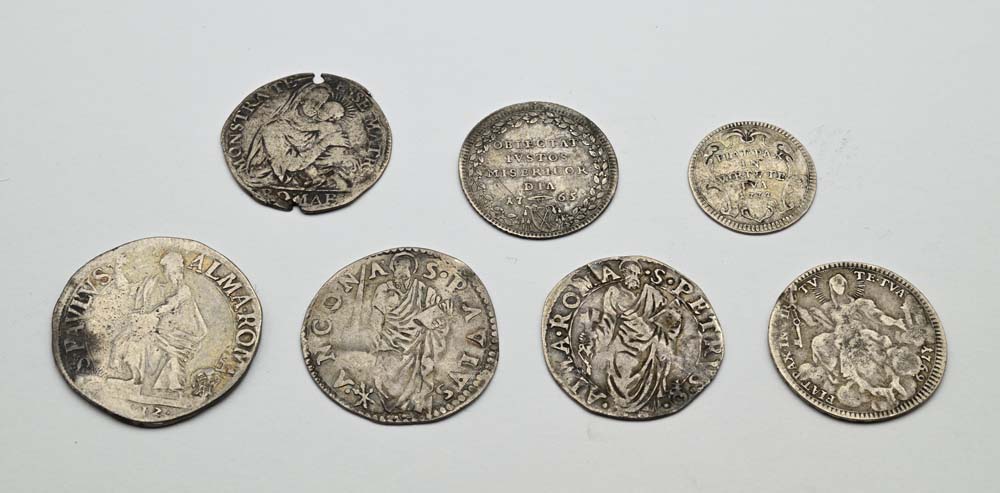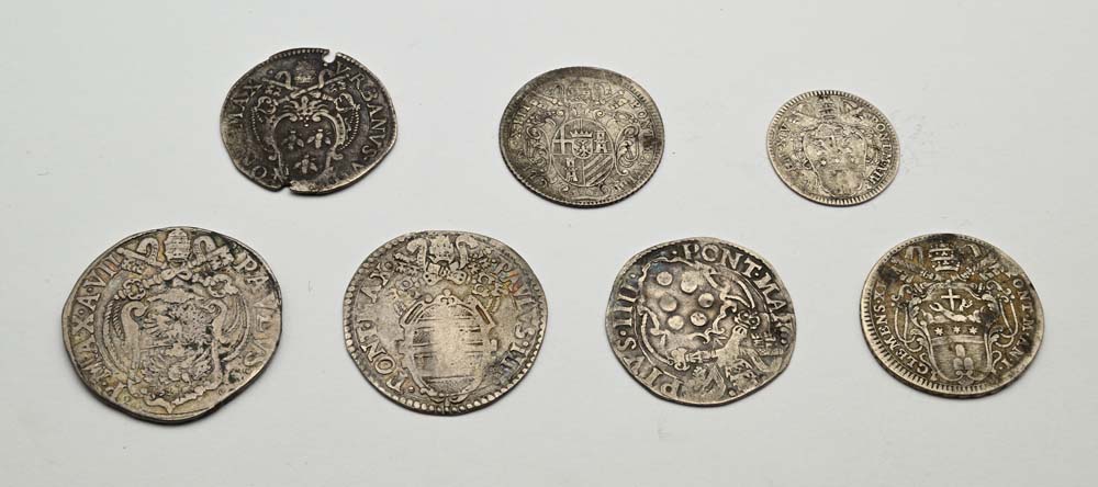 Giulio Pio IV Roma; Giulio Paolo IV Ancona; Testone 1612 A.VII Paolo V Roma; Giulio Urbano VIII Roma; Giulio 1765 A.VIII Clemente XIII; Doppio Giulio 1769 A.I Clemente XIV; Grosso 1773 A.IV Clemente XIV