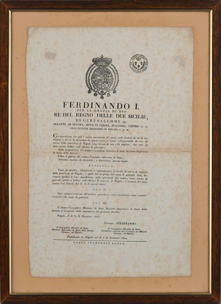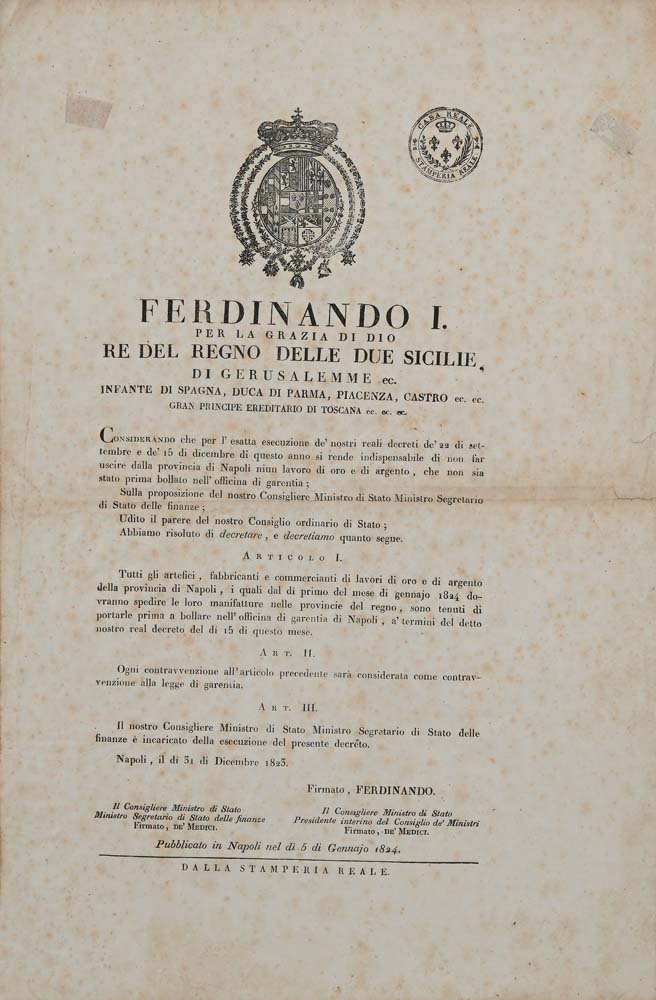Editto Borbonico 31 dicembre 1823 - 5 gennaio 1824 Ferdinando I Re delle Due Sicilie - Artefici, fabbricanti e commercianti di lavori di oro e di argento Editto che regolamenta la bollatura dei manufatti in argento ed oro del Regno delle Due Sicilie