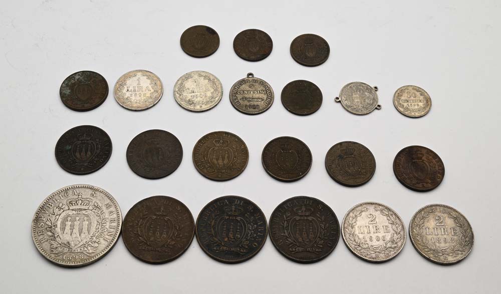 5 Lire 1898, 2 Lire 1898, 1906, 1 Lira 1898 e 1906, 50 Cts 1898 (2), 10 Cts 1875, 1893, 1894, 5 Cts 1864, 1869, 1894, 10 e 5 Cts 1935, 1936, 1937, 1938 e Medaglietta da 5 Cts 1928 San Marino Vecchia monetazione