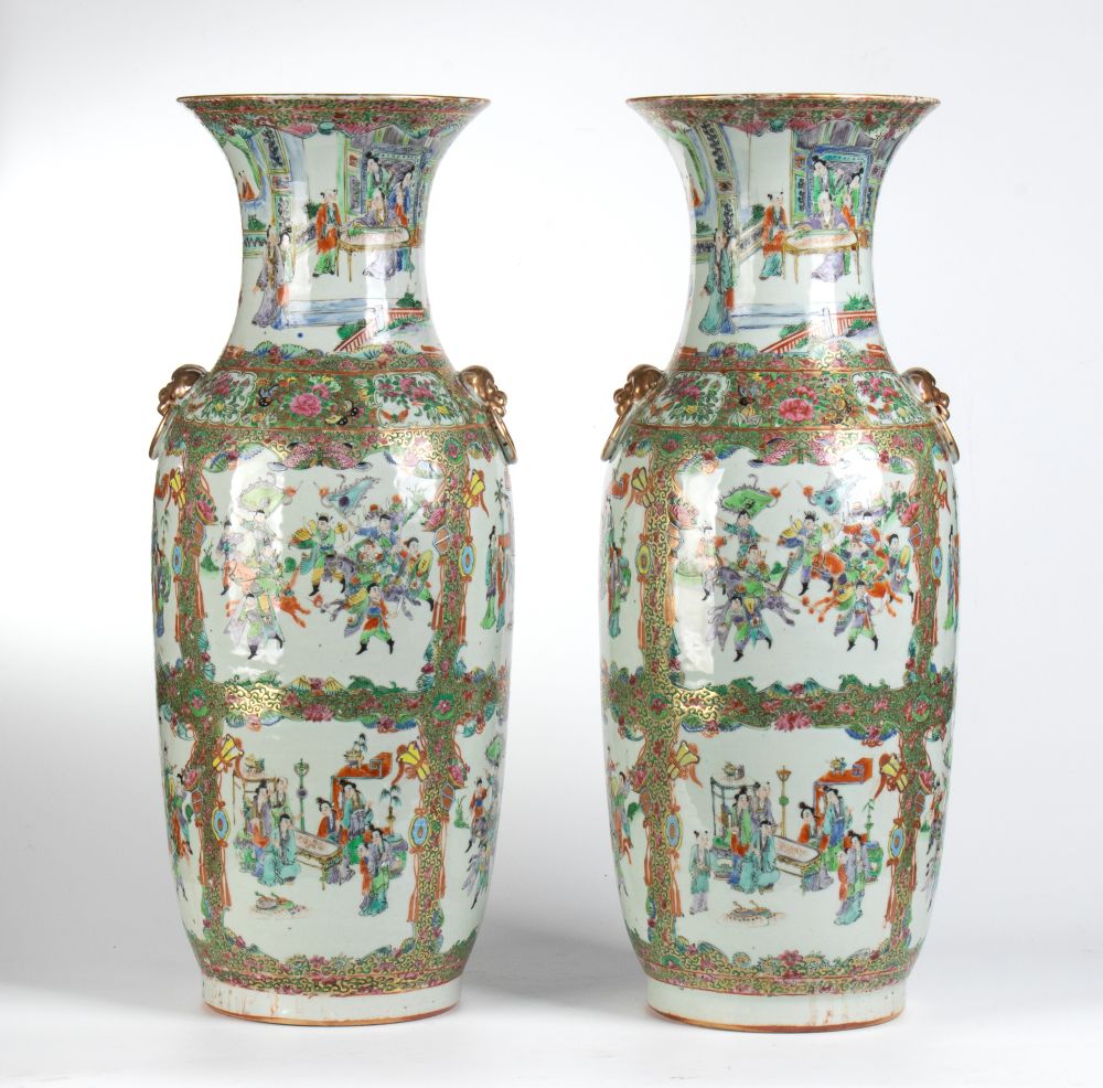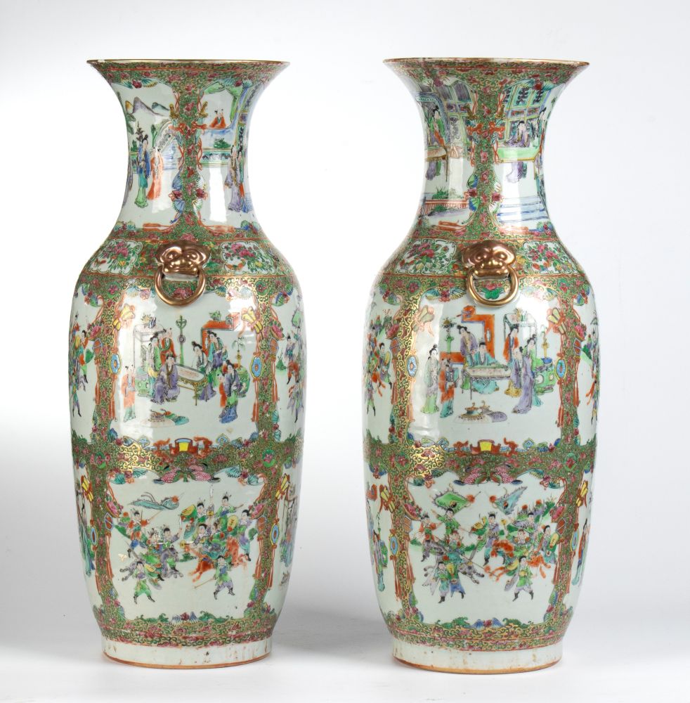 Porcellana Alt.: 60 cm Riccamente decorati a smalti “famille rose” con scene di vita cortigiana e di battaglie entro riserve.