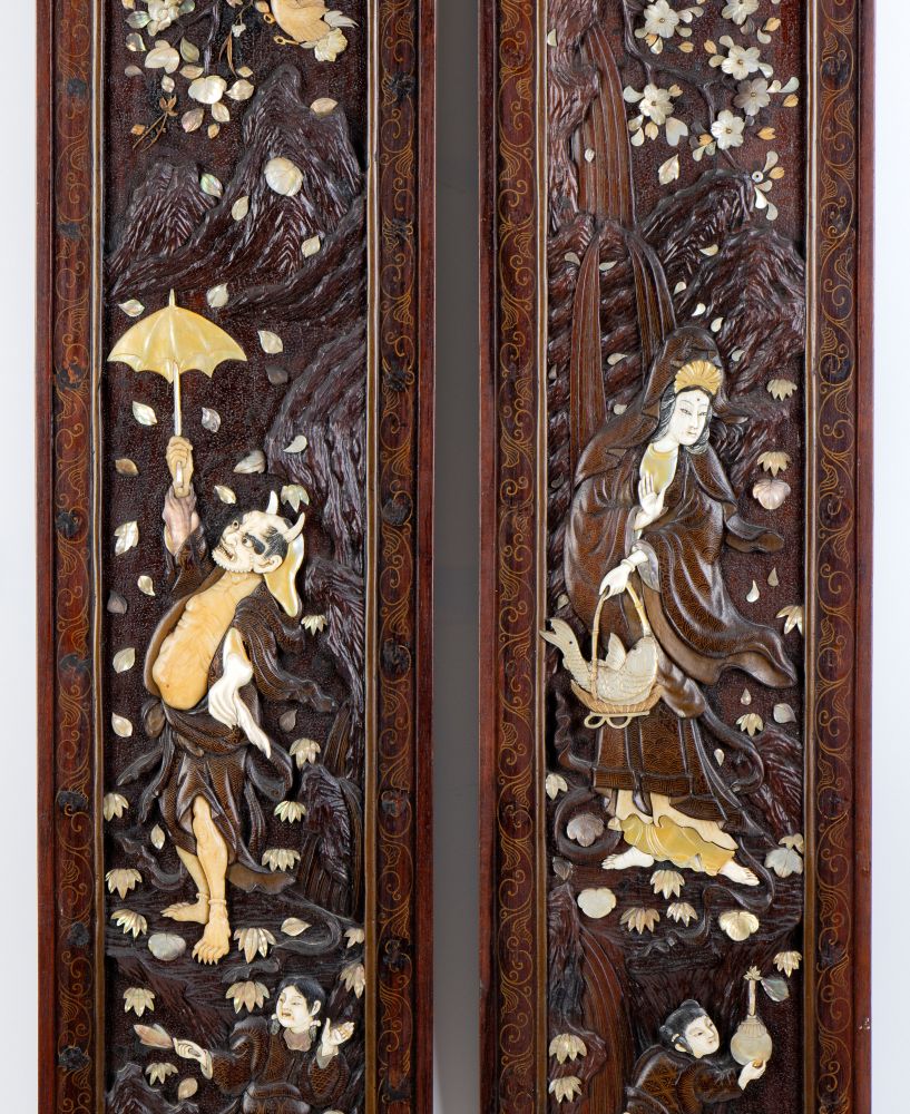 Coppia di pannelli Shibayama intagliati Giappone, periodo Meiji (1880-1890)