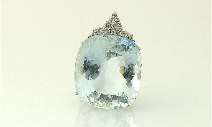 CIONDOLO. In oro bianco 18 kt centrato da acquamarina taglio cuscino di cts. 88,64, diamanti taglio brillante per tot. cts. 0,20 ca., l'acquamarina è accompagnata da certificato N.22060789 del 25/06/2012 Tokio Gem Laboratory (Thailand).
