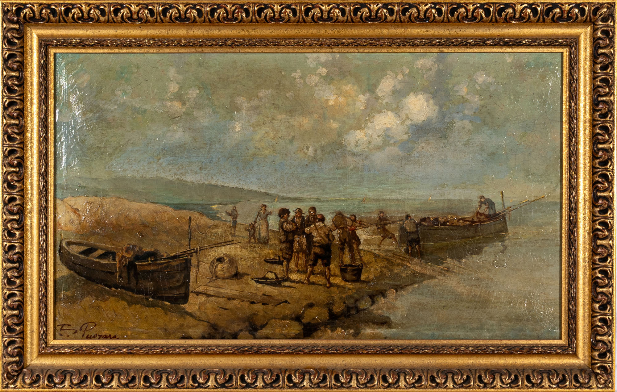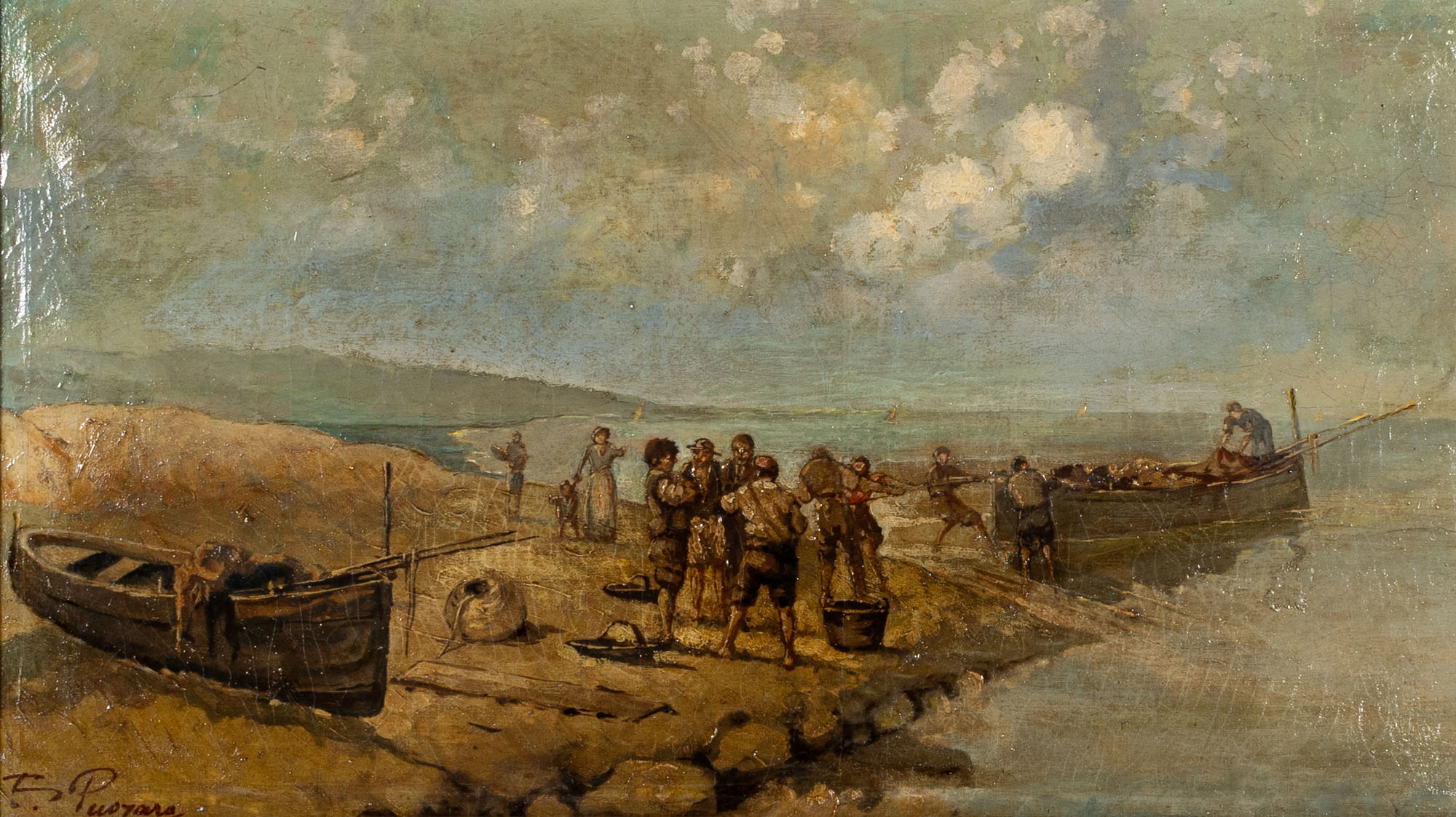 Pittore della fine del secolo XIX - Paesaggio costiero con pescatoriOlio su tela45 x 80 cmFirmato 'Puoyars' in basso a sinistraPROVENIENZA:Collezione privata, Varese