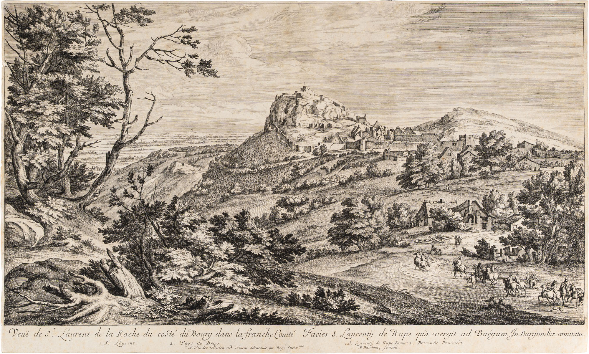 Adriaen Frans Boudewyns (Bruxelles, 1644 - ivi, 1711) da Adam François van der Meulen (Bruxelles, 1632 - Parigi, 1690) - Veduta di Saint Laurent de la RocheAcquaforte41,5 x 69 cm