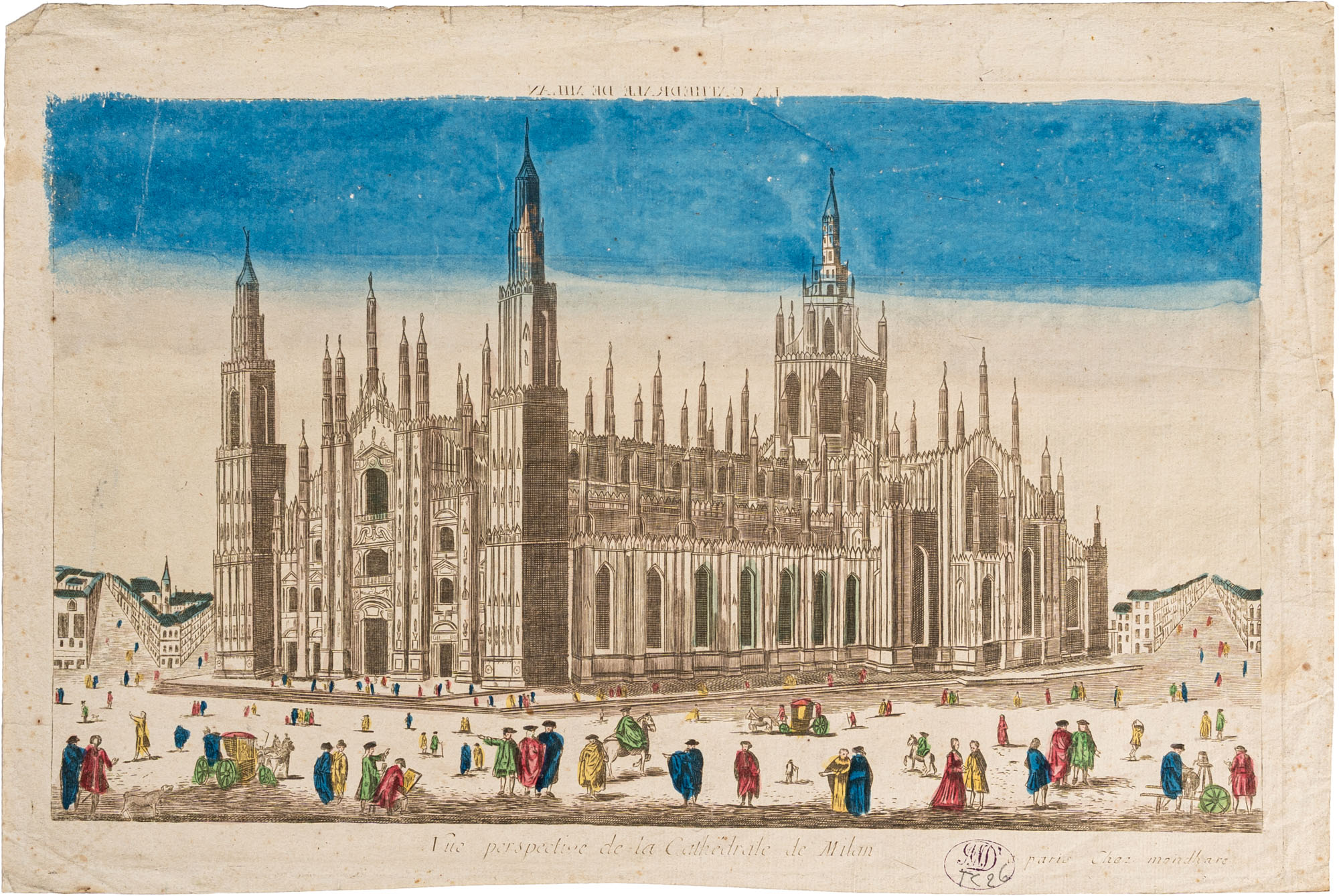 Louis-Joseph Mondhare (1734 - 1749) - Vue perspective de la Cathédrale de Milan. Original 18th Century vue optique. </br>Mondhare, Louis-Joseph, editeur