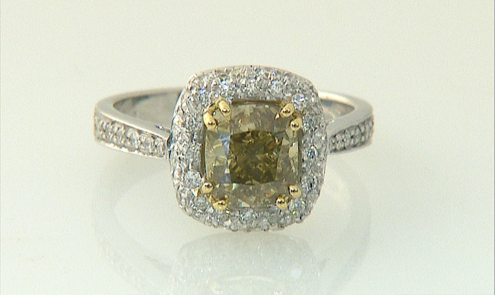 ANELLO. In oro bianco e giallo 18 kt con un diamante fancy dark brown-greenish yellow taglio cuscino modificato brillante con distribuzione uniforme del colore di cts. 2,005, diamanti taglio brillante a decoro per tot. cts. 0,50 ca., il dimante fancy è accompagnato da Certificato Gemmologico N.2165238491 del 26/06/2014 GIA Carlsbad.