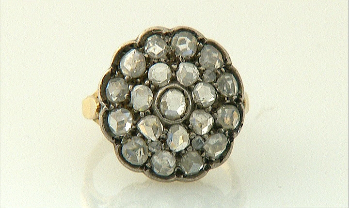 ANELLO INIZIO SECOLO. In oro giallo 18 kt ed argento con gambo in oro scatolato, centrale a bottone in diamanti taglio rosa.