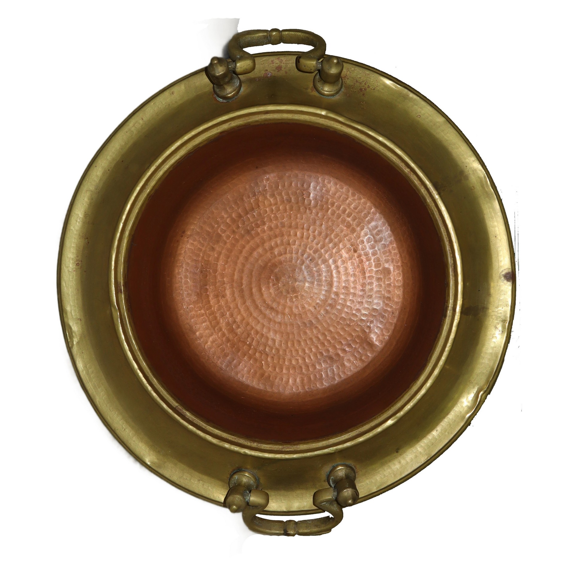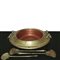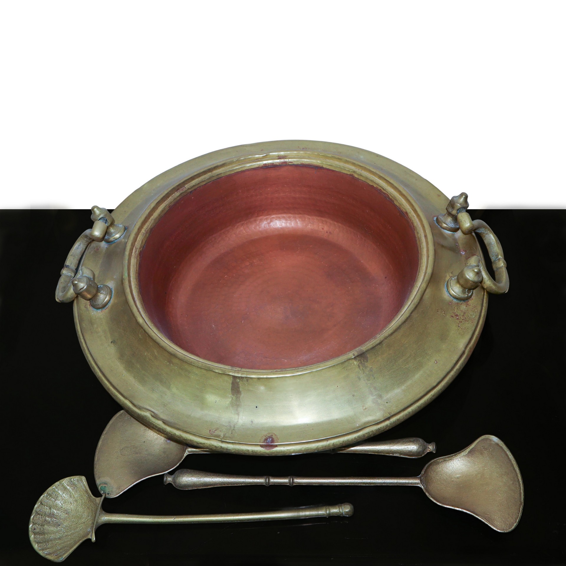 Braciere in ottone dorato con due prese laterali dotato di 3 utensili