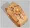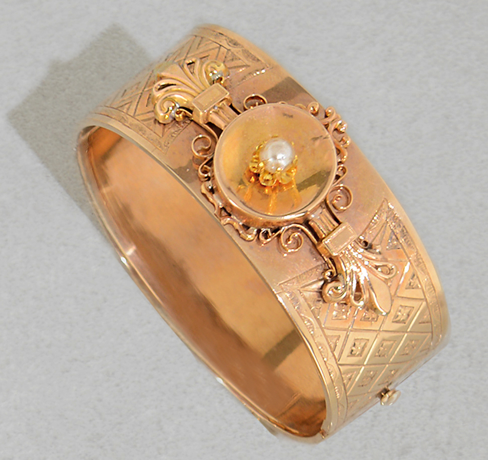 BRACCIALE INIZIO XX SECOLO. In oro giallo 18 kt rigido con al centro motivo a volute imperniato, perla mabè e decori incisi ai lati.