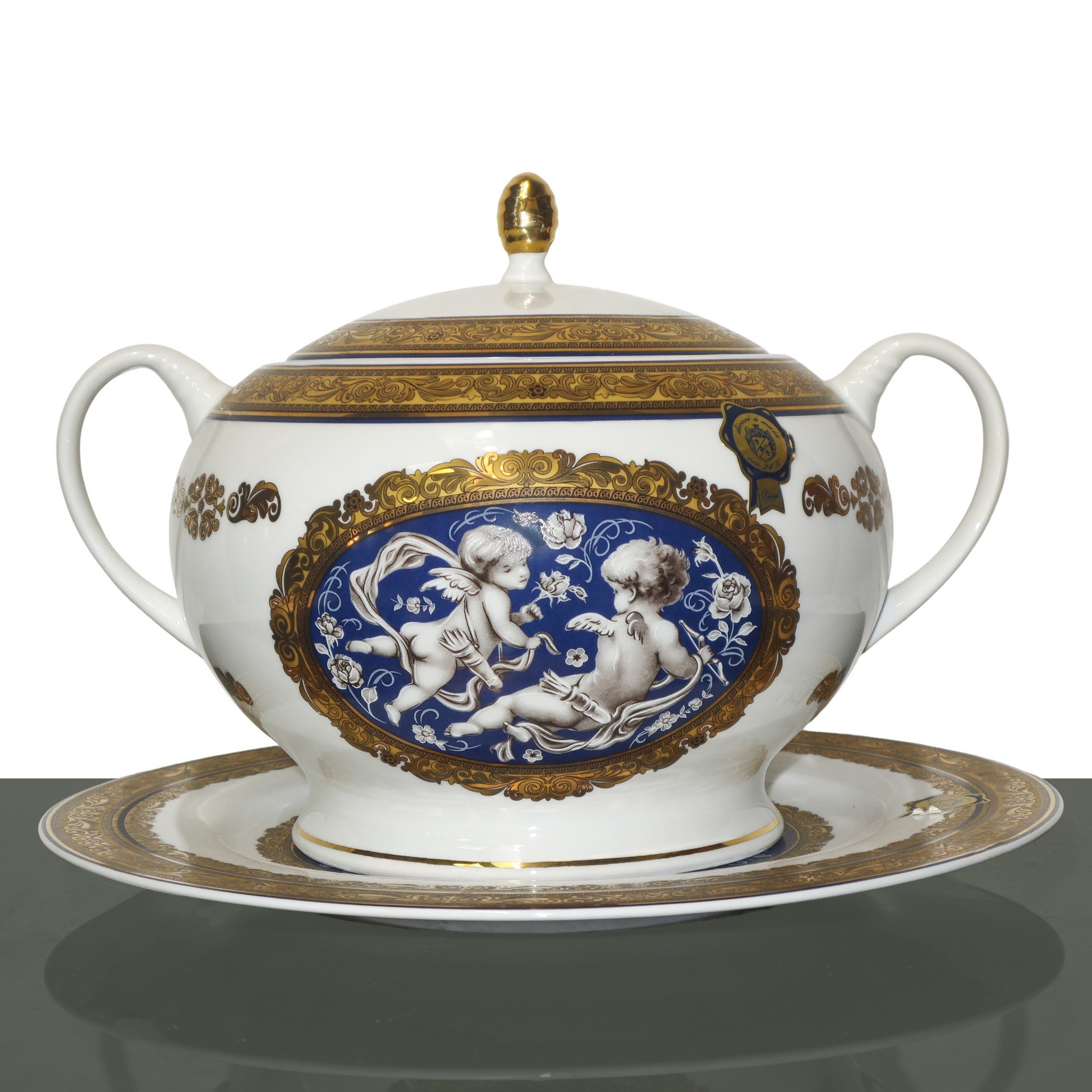 Limoges - Zuppiera con sottopiatto in porcellana con tesa in oro e al centro amorini