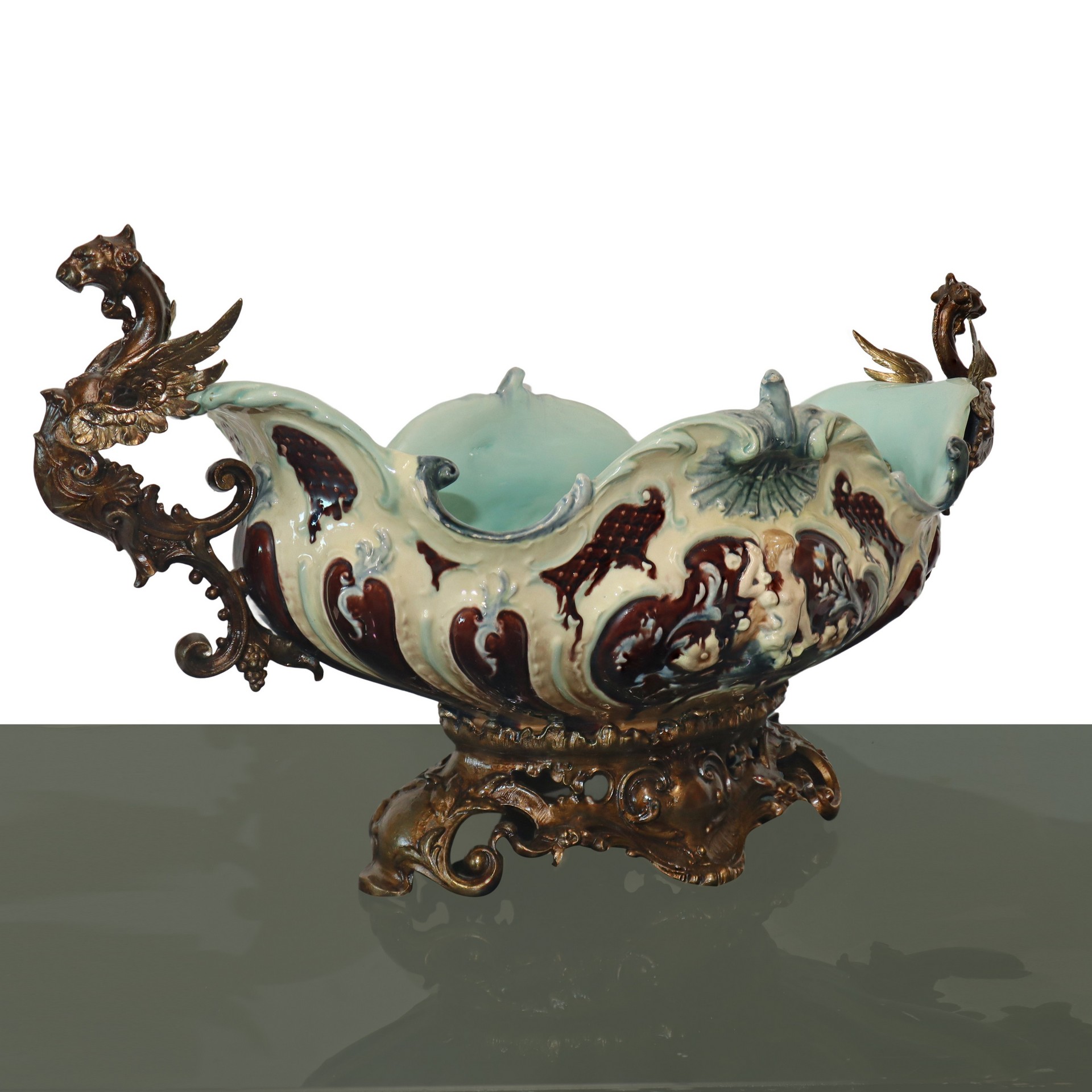 Grande ciatta centrotavola in maiolica con base in metallo e prese con raffigurazioni a grifone, fine 19° secolo