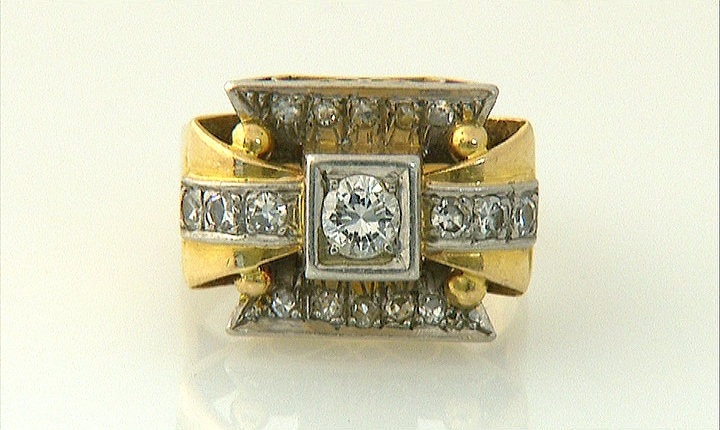 ANELLO ANELLO ANNI '40 CA. In oro giallo e bianco 18 kt montatura a ponte con...