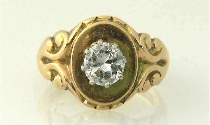 ANELLO INIZIO XX SECOLO. In oro giallo 9 kt montatura scatolata con decori a volute, al centro diamante solitario taglio brillante di cts. 1,00 ca. (prob. colore J purezza P), entro castone a otto griffes.