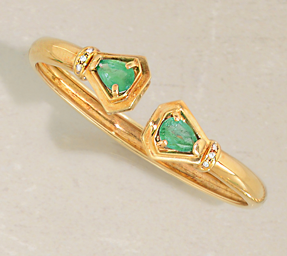 BRACCIALE. In oro giallo 18 kt a schiava con terminali in smeraldi taglio goccia per tot. cts. 3,00 ca. piccoli diamanti taglio brillante a decoro.