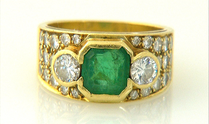ANELLO. In oro giallo 18 kt internamente foderato con smeraldo taglio rettangolare a contorno ottagonale di cts. 2,40 ca., due diamanti taglio brillante ai lati per tot. cts. 1,10 ca. entro decoro in diamanti taglio brillante per tot. cts. 1,90 ca.