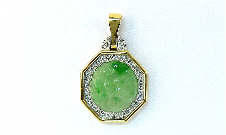 CIONDOLO. In oro giallo e bianco 18 kt di forma ottagonale con giada scolpita in altorilievo entro cornice in diamanti taglio brillante per tot. cts. 0,70 ca.