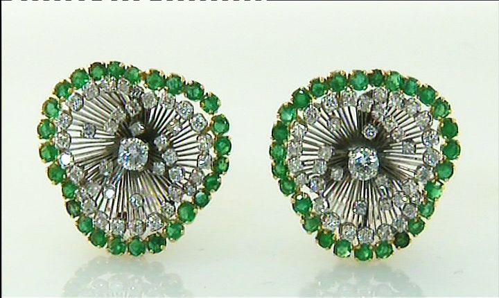 COPPIA DI ORECCHINI. In oro giallo e bianco 14 kt realizzati a raggiera con bordo trilobato, diamanti taglio brillante per tot. cts. 3,00 ca. e smeraldi taglio rotondo per tot. cts. 4,00 ca.