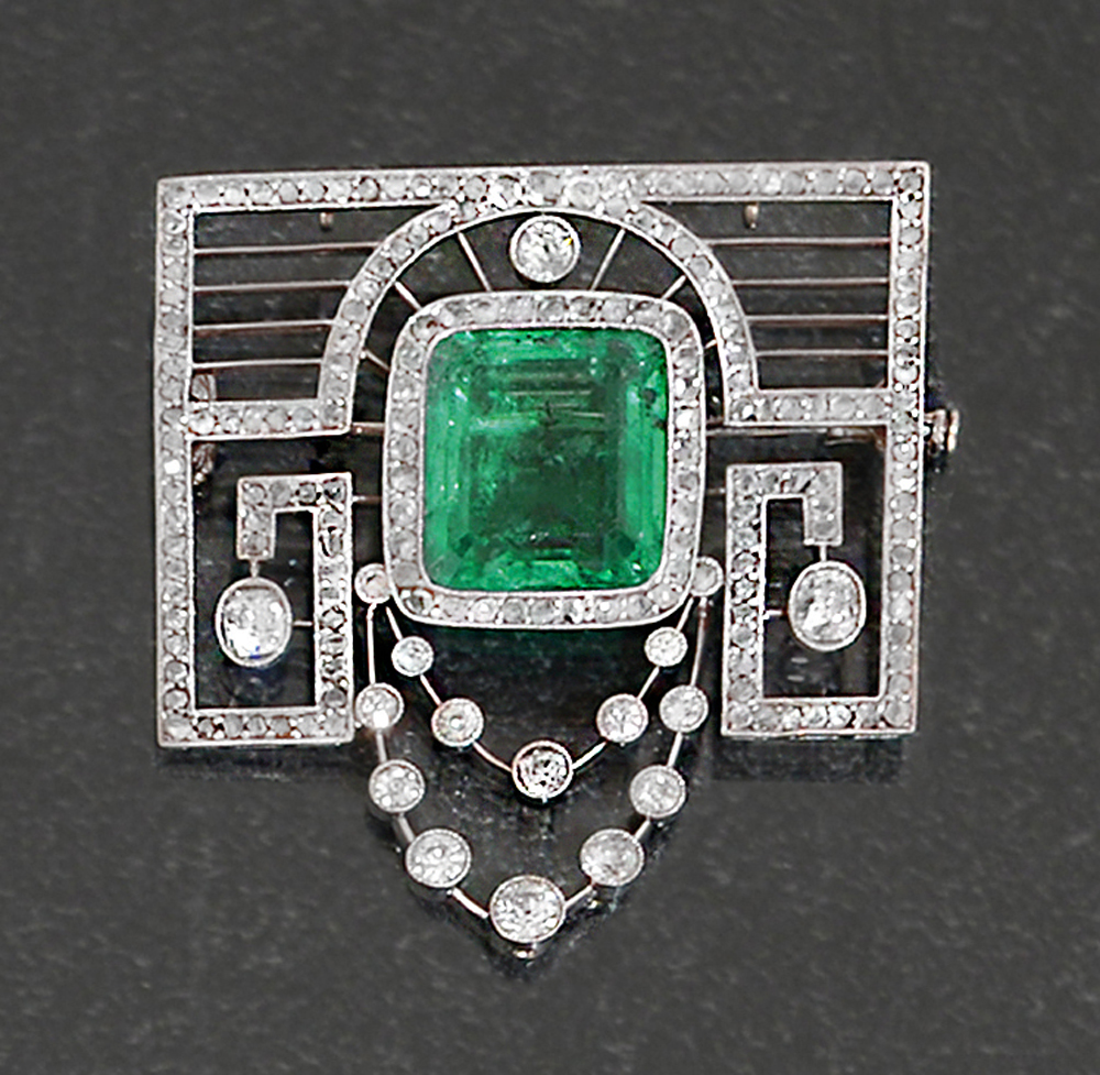 SPILLA-CIONDOLO ANNI '20 CA. In platino di forma rettangolare con centrale frangiato, raffinata lavorazione a griglia con angolari a greca, decoro a milligrano ed al centro smeraldo Colombia taglio cuscino di cts. 5,80 ca. (insignificanti indicazioni di miglioramenti Oil-type), diamanti taglio vecchio e rosa per tot. cts. 1,22 ca. chiusura ad ago semplice con allegato Certificato gemmologico N.CDC1410154 del 14/10/2014 C.Dunaigre Lucerna.