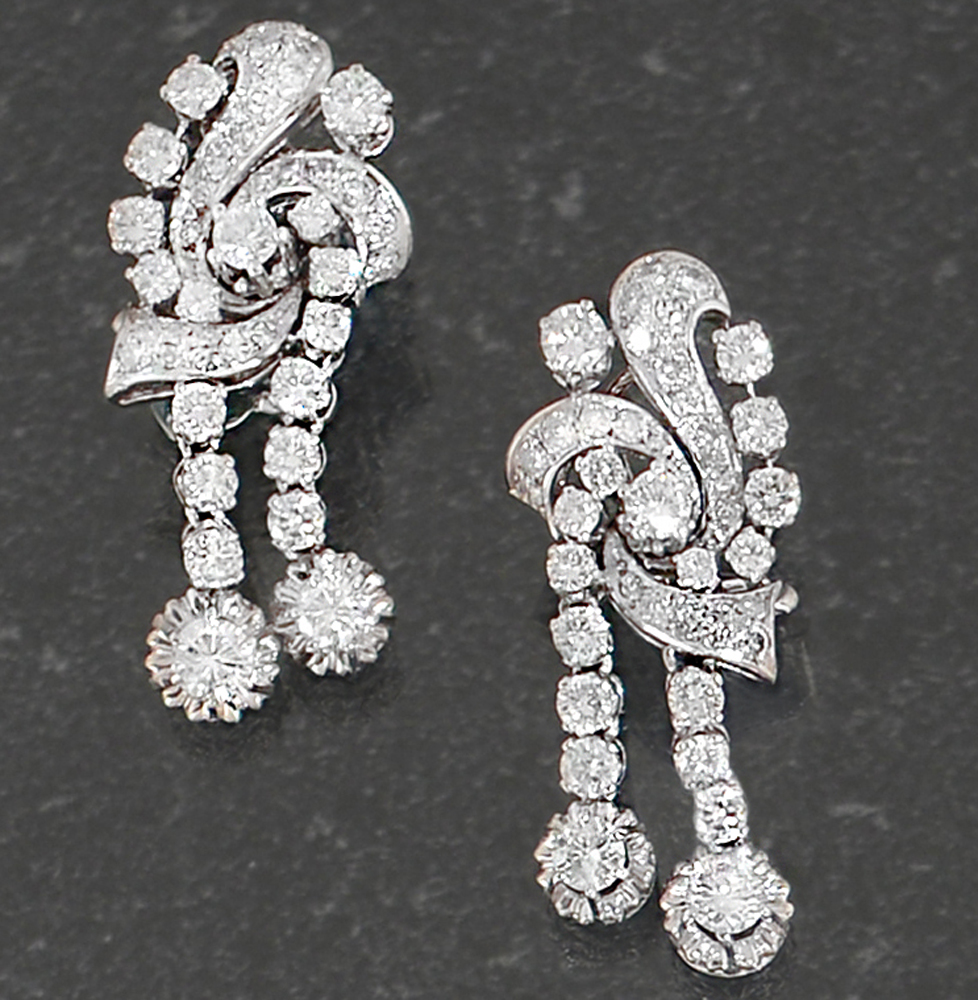 COPPIA DI ORECCHINI PENDENTI ANNI '50 CA. In oro bianco 18 kt perno e clip, motivi a volute con terminali frangiati, diamanti taglio brillante e huit-huit per tot. cts. 6,00 ca.