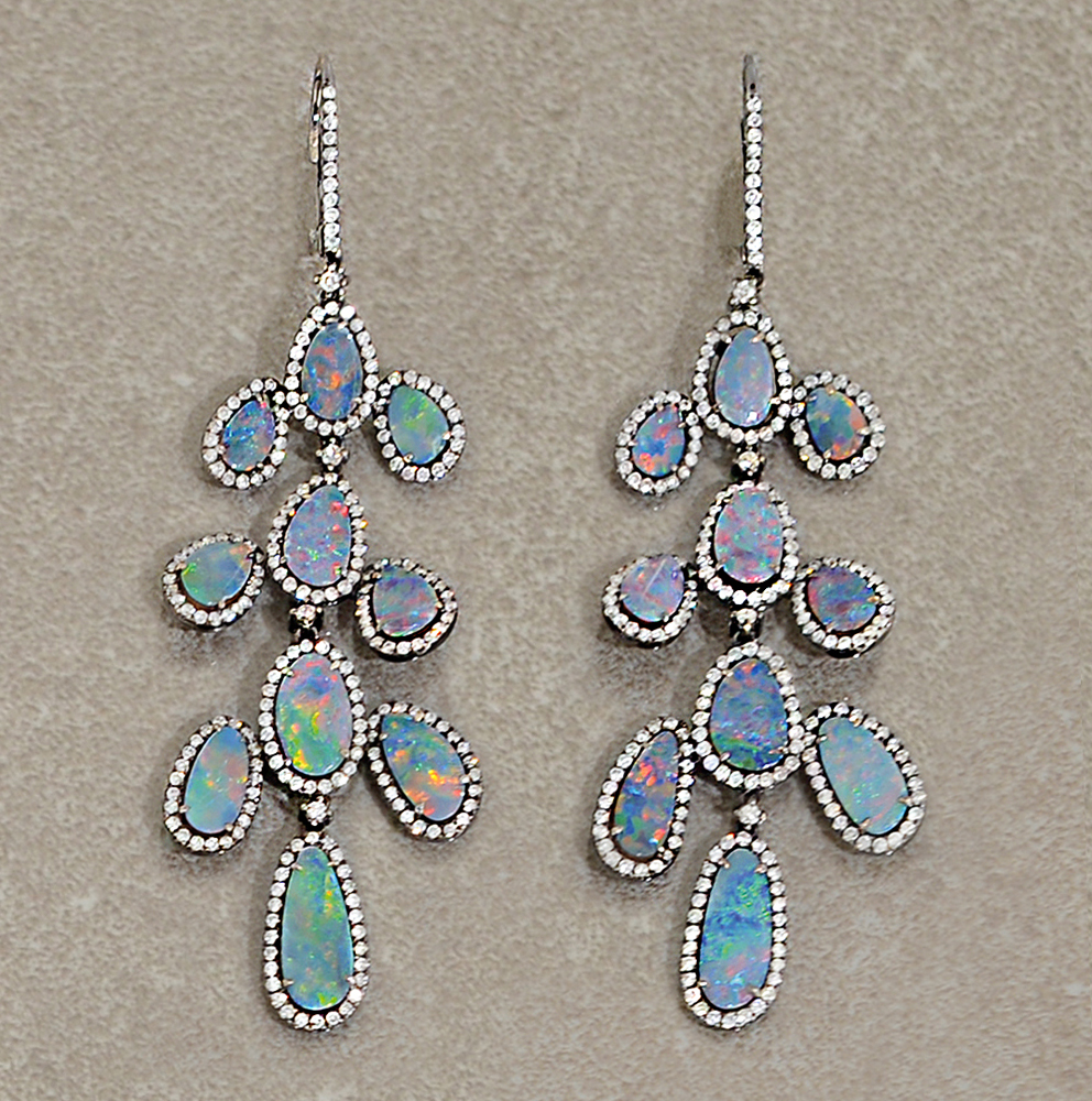 COPPIA DI ORECCHINI PENDENTI. In oro bianco brunito 18 kt perno e clip con diamanti taglio brillante per tot. cts. 2,60 ca. ed inserti in opale taglio fantasia.