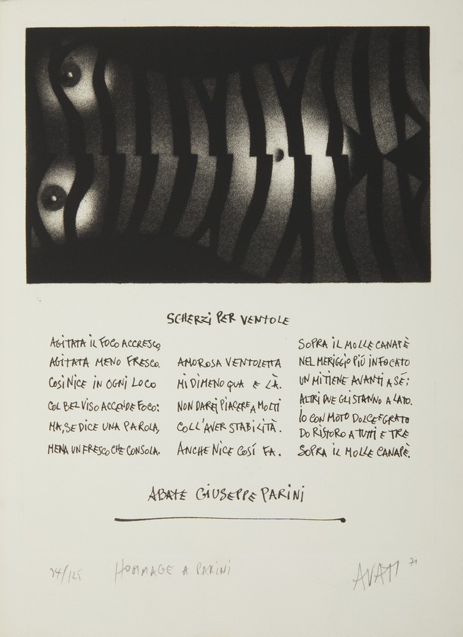 AVATI MARIO (1921 - 2009) HOMMAGE A PARINI . 1971. acquaforte. Cm 25,50 x 34,00. firma, titolo, data e tiratura a matita, es. 34/125