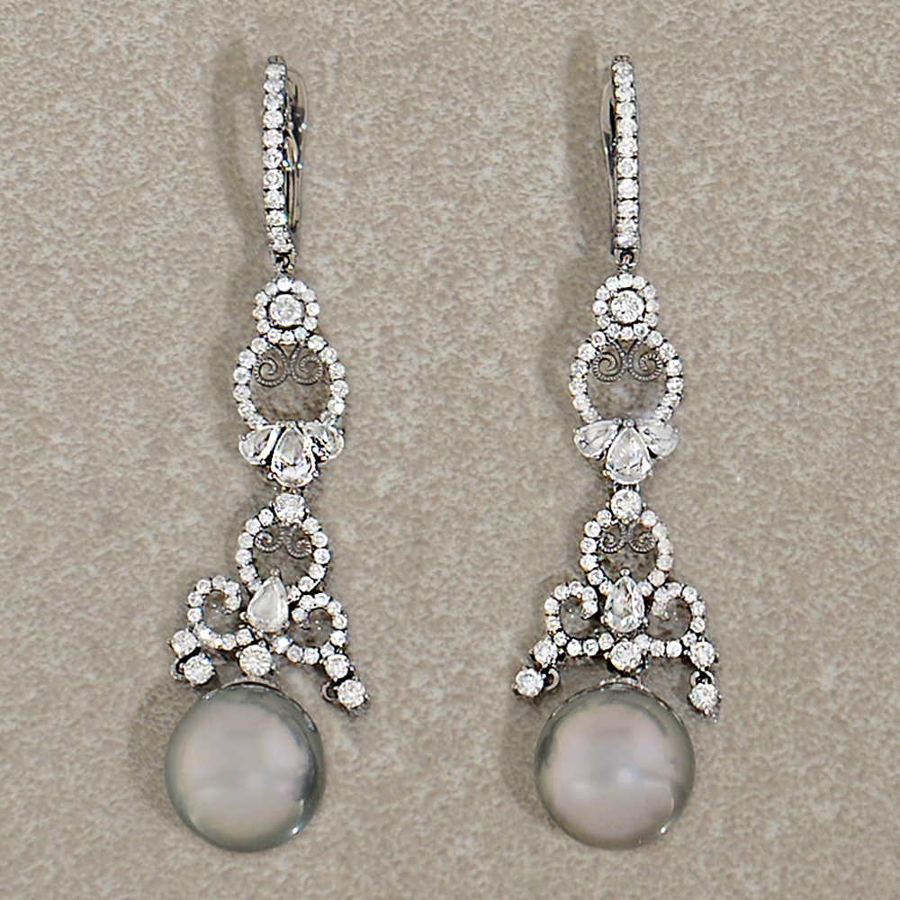 COPPIA DI ORECCHINI PENDENTI. In oro bianco brunito 18 kt perno e clip con diamanti taglio rosa e brillante per tot. cts. 2,80 ca., perle coltivate Tahiti di mm 13 ca. su perno oscillante.